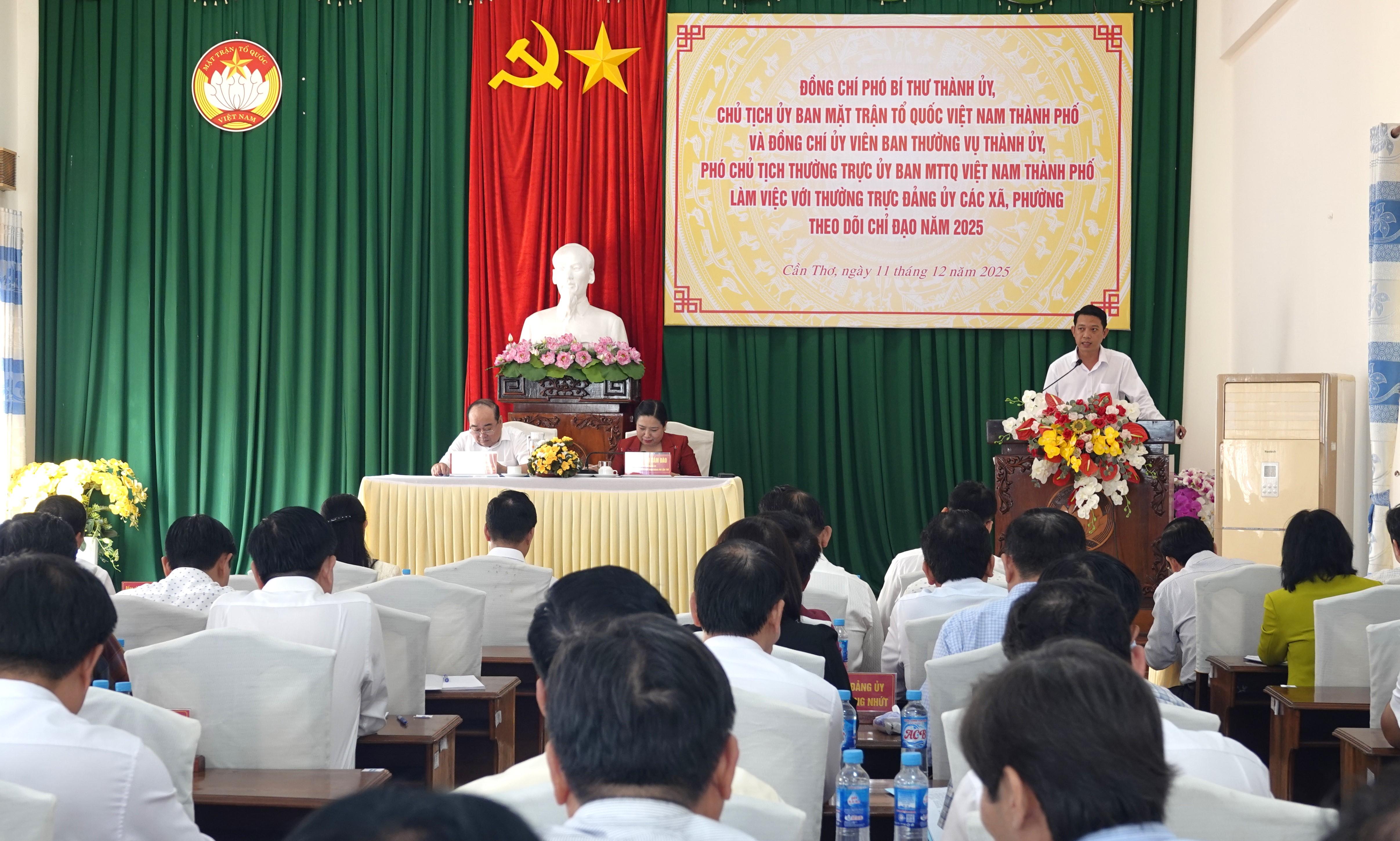 Làm việc với các xã, phường lãnh đạo Ủy ban MTTQVN TP Cần Thơ ghi nhận những kết quả nổi bật trong tổ chức bộ máy, phát triển kinh tế - xã hội và chăm lo đời sống Nhân dân từ khi mô hình chính quyền địa phương 2 cấp đi vào hoạt động. Các địa phương được yêu cầu tập trung thực hiện tốt công tác bầu cử, chăm lo Tết, giữ vững an ninh trật tự và nâng cao chất lượng phục vụ người dân.