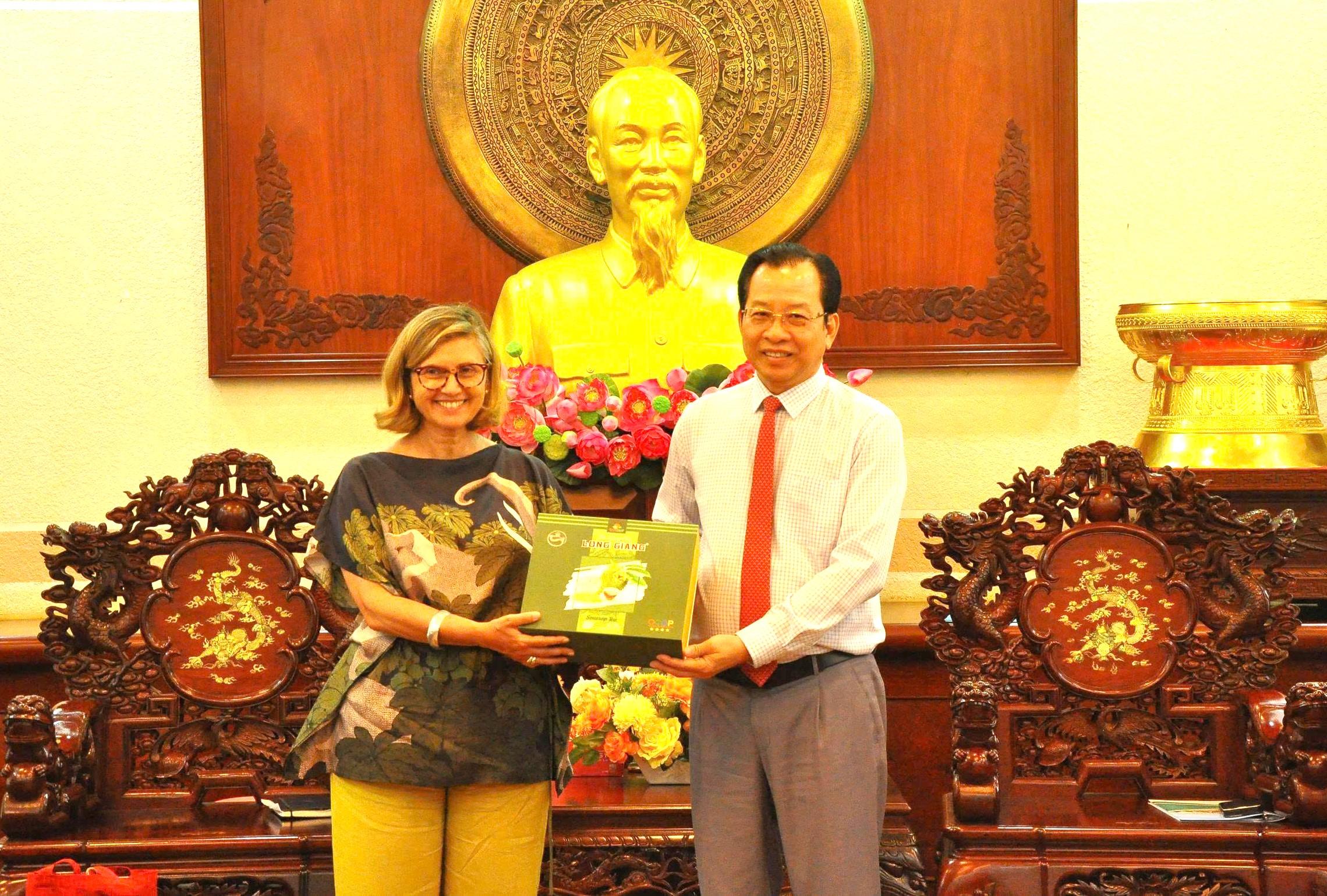 Ông Vương Quốc Nam, Phó Chủ tịch UBND TP Cần Thơ, tặng quà lưu niệm cho bà Francesca Bellone tại buổi tiếp.