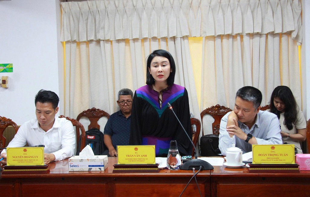 Bà Trần Vân Anh, Giám đốc phát triển dự án khu vực phía Nam Tập đoàn Vingroup thông tin tình hình triển khai dự án Khu đô thị du lịch nghỉ dưỡng Mekong tại buổi làm việc với lãnh đạo thành phố.