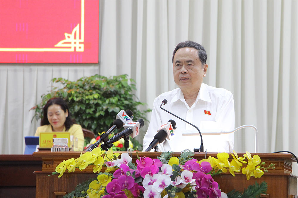 Ông Trần Thanh Mẫn, Ủy viên Bộ Chính trị, Chủ tịch Quốc hội, phát biểu tại buổi tiếp xúc cử tri. Ảnh: PHƯỚC THUẬN.