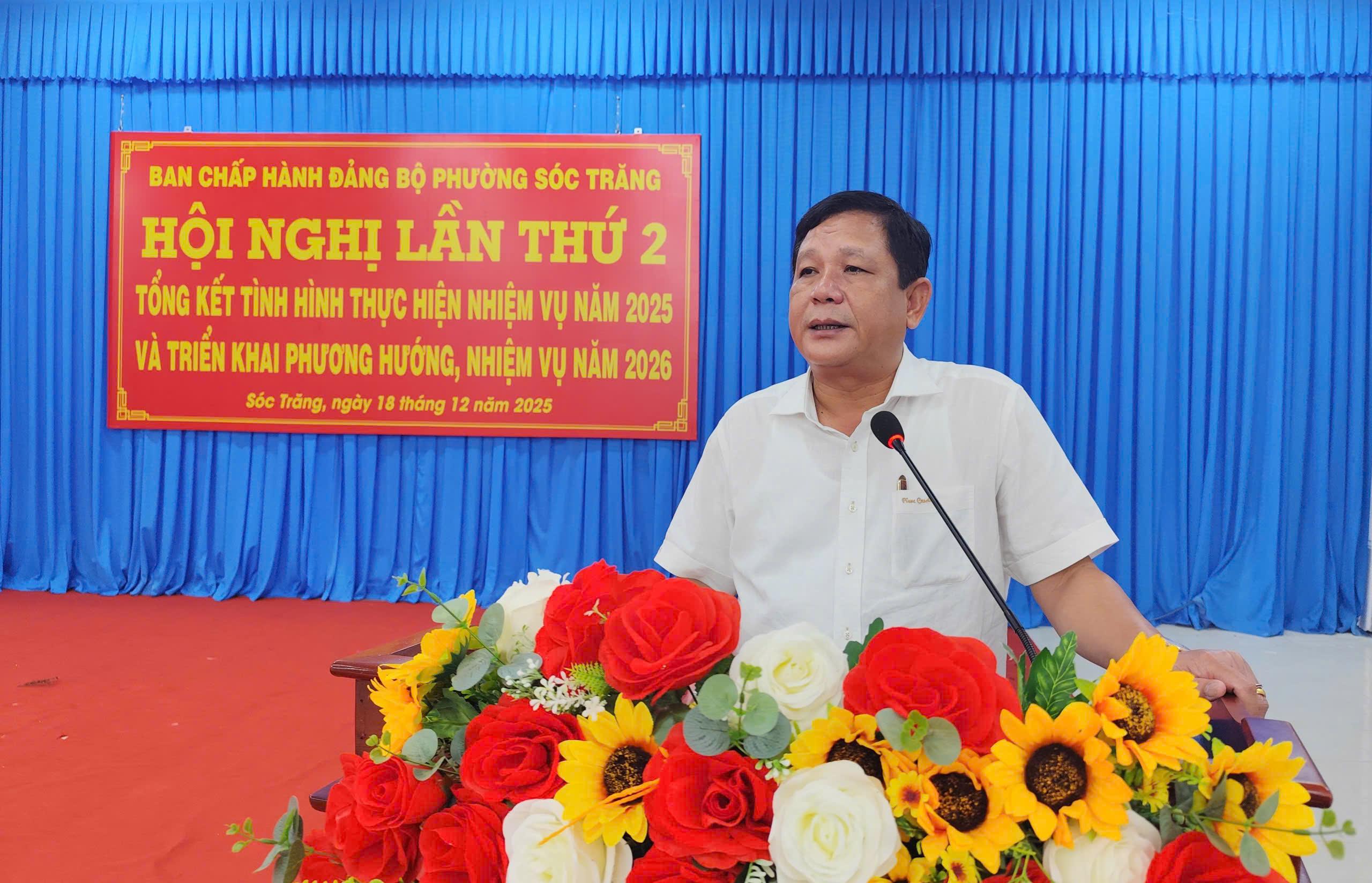 Phát biểu kết luận hội nghị, đồng chí Dương Sà Kha, Ủy viên Ban Thường vụ Thành ủy, Bí thư Đảng ủy phường Sóc Trăng ghi nhận và biểu dương những nỗ lực, kết quả đạt được của toàn Đảng bộ, chính quyền và Nhân dân phường Sóc Trăng trong năm 2025.