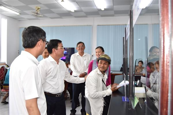 Đồng chí Trần Văn Huyến (người đứng thứ 2, từ bên trái), Phó Bí thư Thành ủy Cần Thơ, khảo sát tình hình hoạt động tại Trung tâm Phục vụ hành chính công phường Phú Lợi.