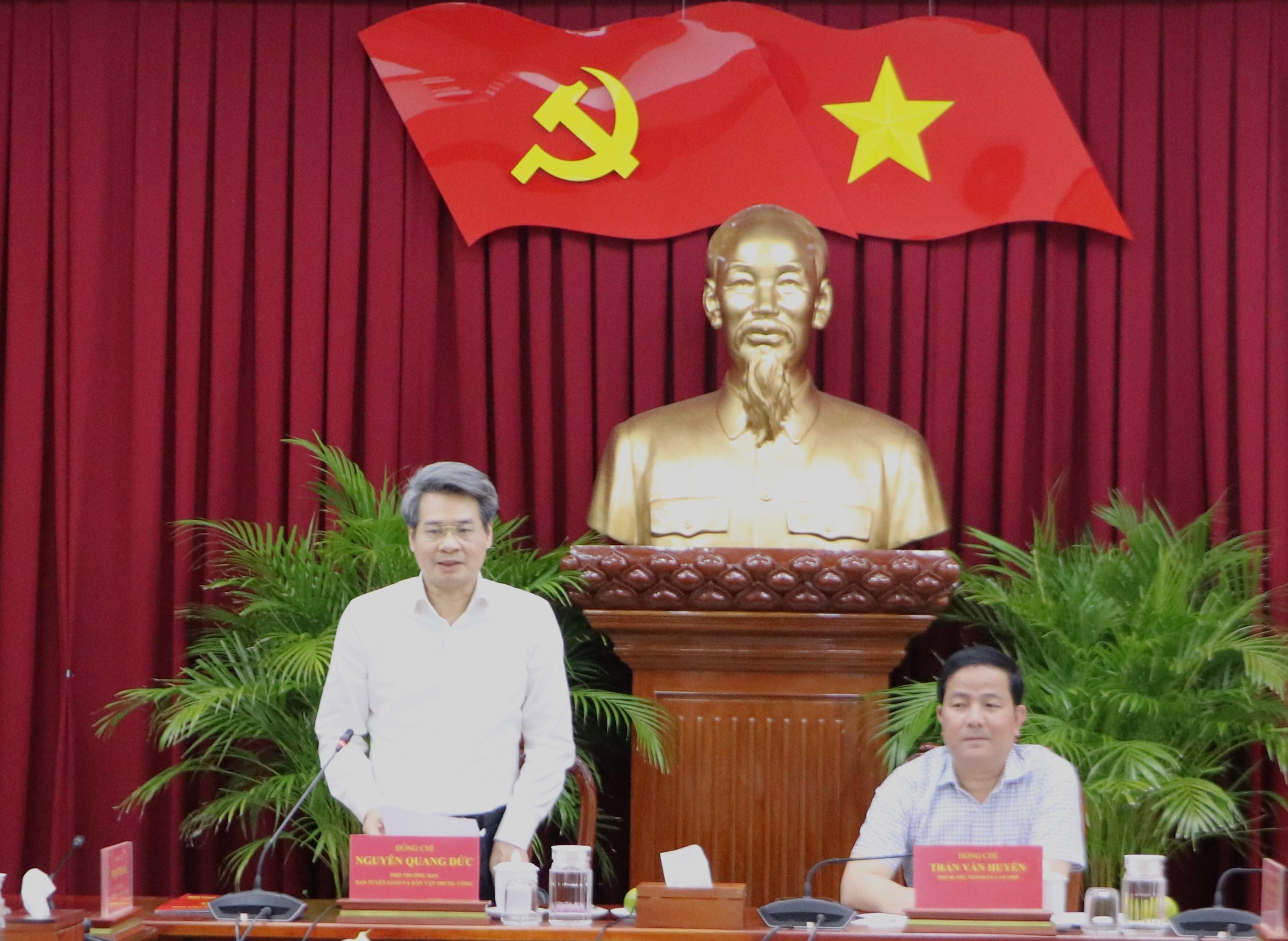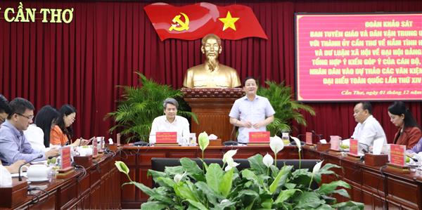 Đồng chí Nguyễn Quang Đức, Phó Trưởng Ban Tuyên giáo và Dân vận Trung ương, phát biểu tại buổi làm việc với Thành ủy Cần Thơ về nắm tình hình Nhân dân và dư luận xã hội về đại hội đảng bộ các cấp; tổng hợp ý kiến đóng góp của cán bộ, đảng viên và Nhân dân vào dự thảo các văn kiện trình Đại hội đại biểu toàn quốc lần thứ XIV của Đảng. Ảnh: Huỳnh Thị Trúc Huyền.