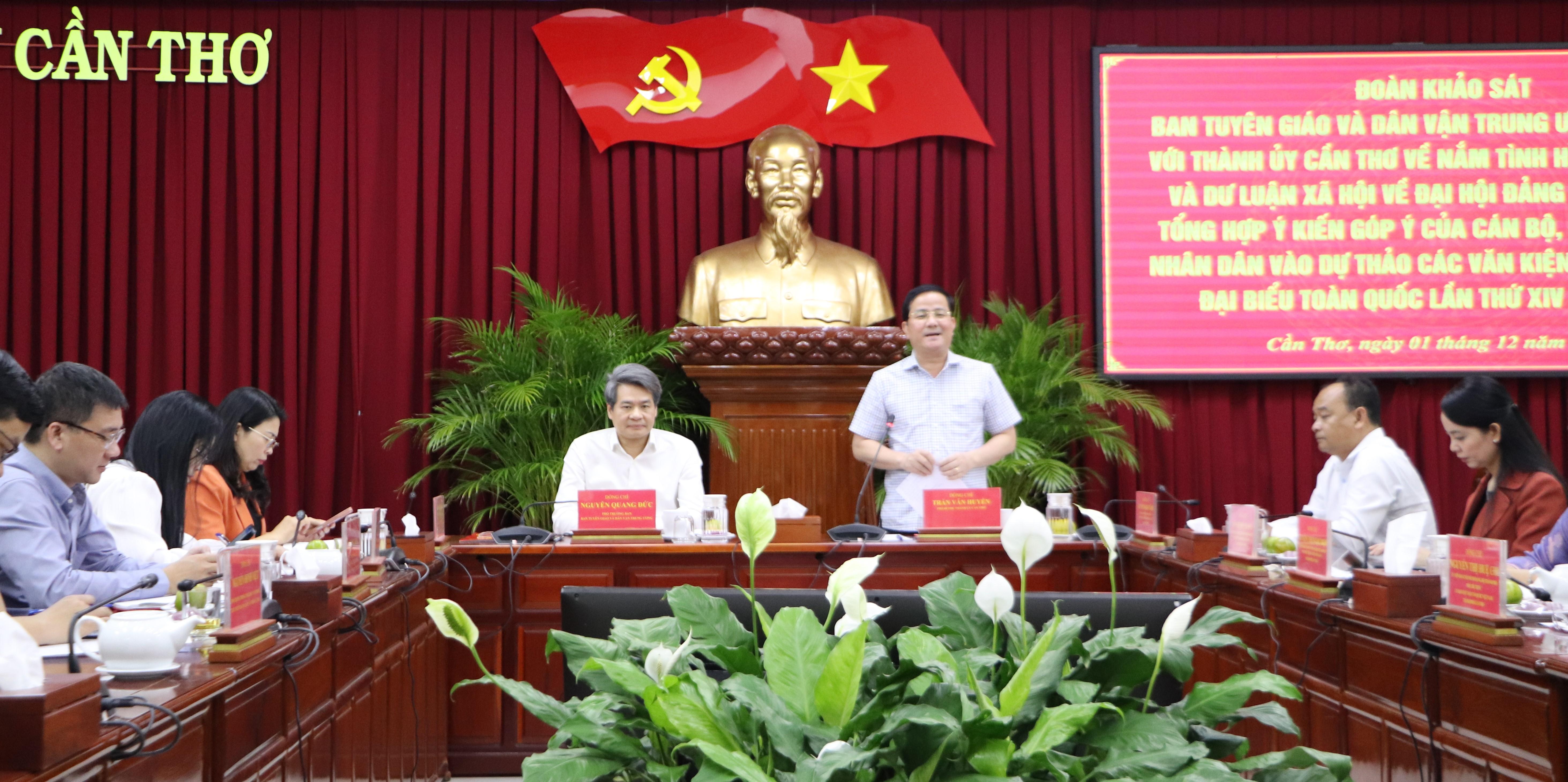 Đồng chí Trần Văn Huyến, Phó Bí thư Thành uỷ Cần Thơ phát biểu tại buổi tiếp Đoàn khảo sát Ban Tuyên giáo và Dân vận Trung ương về nắm tình hình Nhân dân và dư luận xã hội về đại hội đảng bộ các cấp; tổng hợp ý kiến đóng góp của cán bộ, đảng viên và Nhân dân vào dự thảo các văn kiện trình Đại hội đại biểu toàn quốc lần thứ XIV của Đảng. Ảnh: Huỳnh Thị Trúc Huyền.