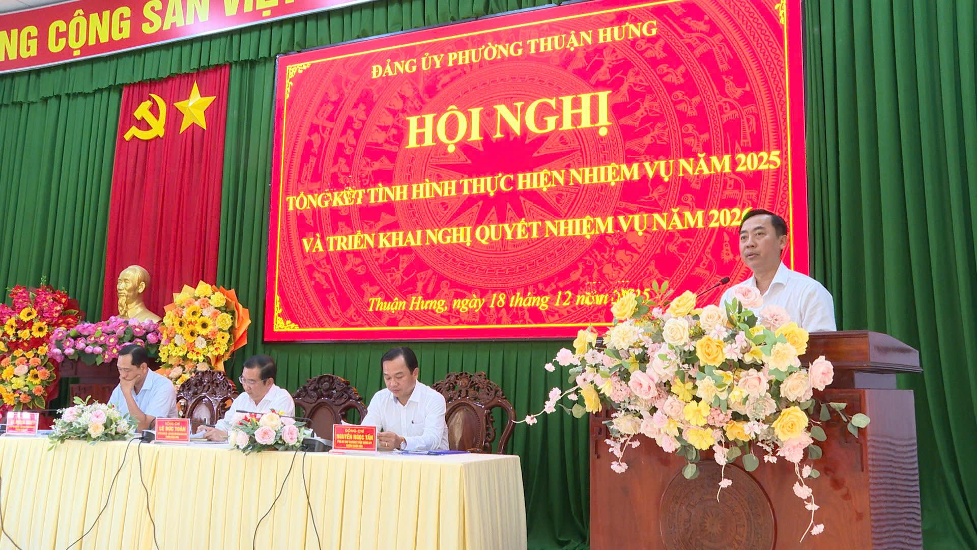 Ghi nhận và đánh giá cao những kết quả mà địa phương đạt được trong năm 2025, đồng chí Đào chí Nghĩa, Ủy viên Ban Chấp hành Đảng bộ thành phố, Phó Trưởng đoàn chuyên trách Đoàn đại biểu Quốc hội thành phố đề nghị thời gian tới, Đảng ủy phường Thuận Hưng cần tiếp tục nỗ lực, đưa mô hình chính quyền địa phương 02 cấp hoạt động ngày càng hiệu quả, thông suốt; thực hiện tốt công tác quy hoạch, kiện toàn, sắp xếp bộ máy cũng như đội ngũ cán bộ, đảng viên đảm bảo hoàn thành tốt các nhiệm vụ được giao; tăng cường công tác chuyển đổi số gắn với đào tạo, bồi dưỡng cán bộ về năng lực, kỹ năng số, đáp ứng được yêu cầu nhiệm vụ trong tình hình mới. Phát động phong trào sáng kiến công vụ trong cán bộ, đảng viên; đẩy mạnh các phong trào thi đua chào mừng các ngày lễ, sự kiện chính trị quan trọng của đất nước và địa phương, nhất là chào mừng Đại hội đại biểu toàn quốc lần thứ XIV của Đảng, bầu cử đại biểu Quốc hội khóa XVI và bầu cử đại biểu HĐND các cấp, nhiệm kỳ 2026 - 2031. Duy trì và nhân rộng các mô hình hay, cách làm sáng tạo trong quá trình phát triển kinh tế - xã hội. Tiếp tục tạo điều kiện và tháo gỡ khó khăn cho các doanh nghiệp trong quá trình phát triển; thực hiện tốt các chính sách an sinh xã hội, chăm lo kịp thời cho các đối tượng dịp tết; đảm bảo giữ vững ổn định an ninh chính trị, trật tự an toàn xã hội tại địa phương.