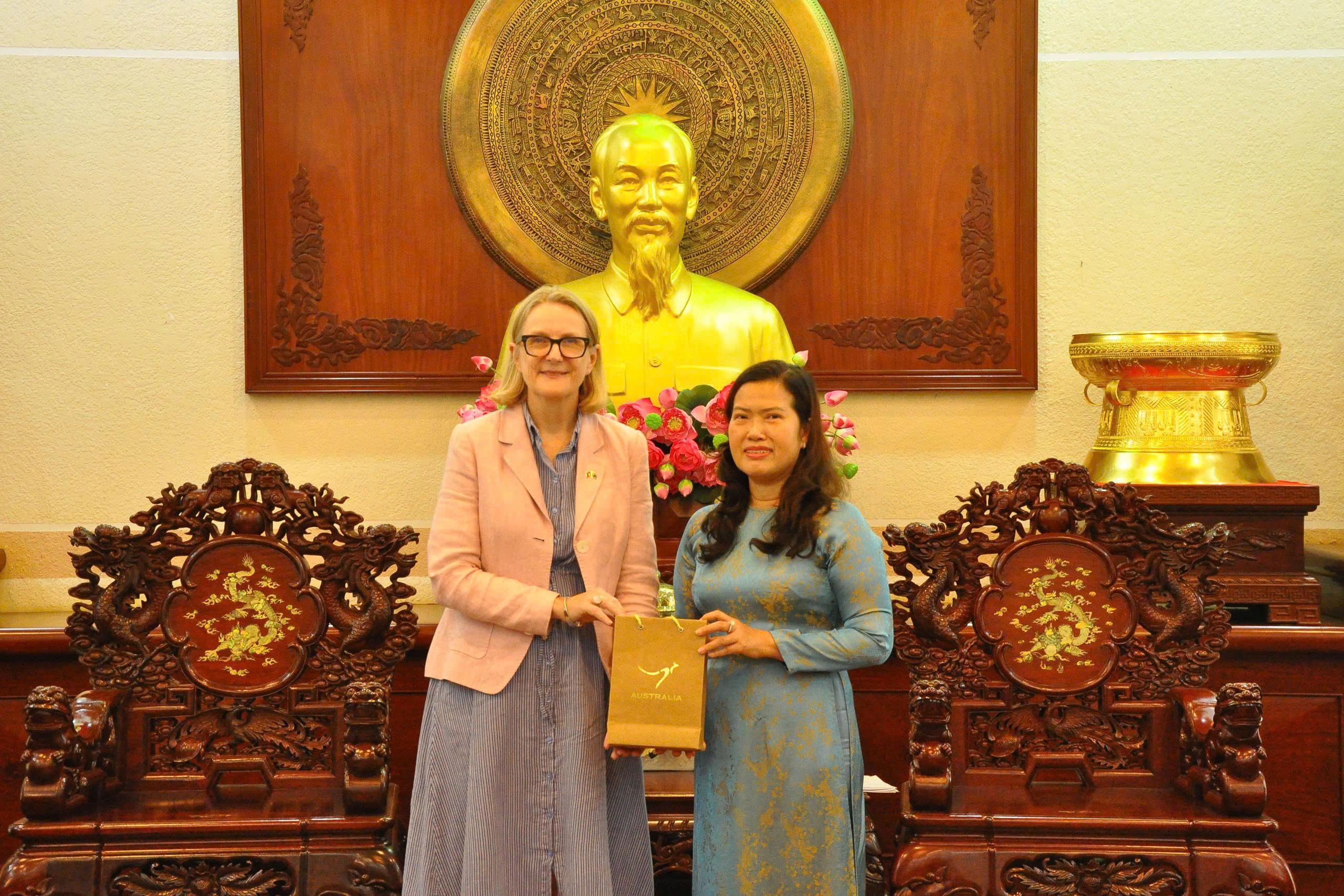 Bà Sarah Hooper, Tổng Lãnh sự Úc tại thành phố Hồ Chí Minh tặng quà lưu niệm cho bà Nguyễn Thị Ngọc Điệp, Phó Chủ tịch UBND thành phố Cần Thơ tại buổi tiếp.