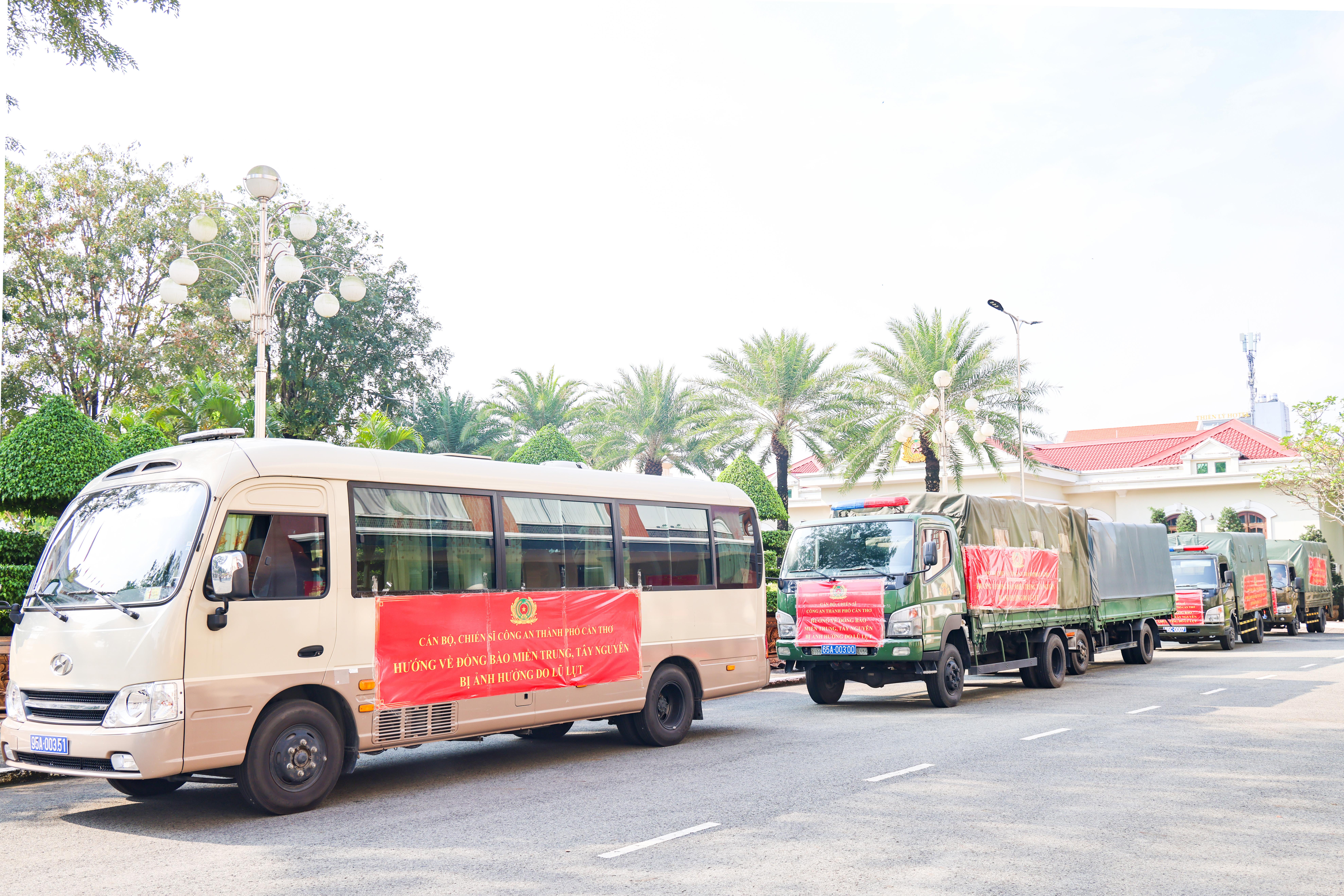 Đoàn công tác Công an TP Cần Thơ xuất quân hỗ trợ đồng bào miền Trung và Tây Nguyên đang chịu thiệt hại nặng nề do mưa lũ. Ảnh: Quang Huy.