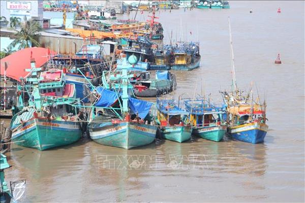 | Các đội tàu neo đậu tại cửa biển sông Đốc (tỉnh Cà Mau). (Ảnh: Hoàng Hùng/TTXVN) |