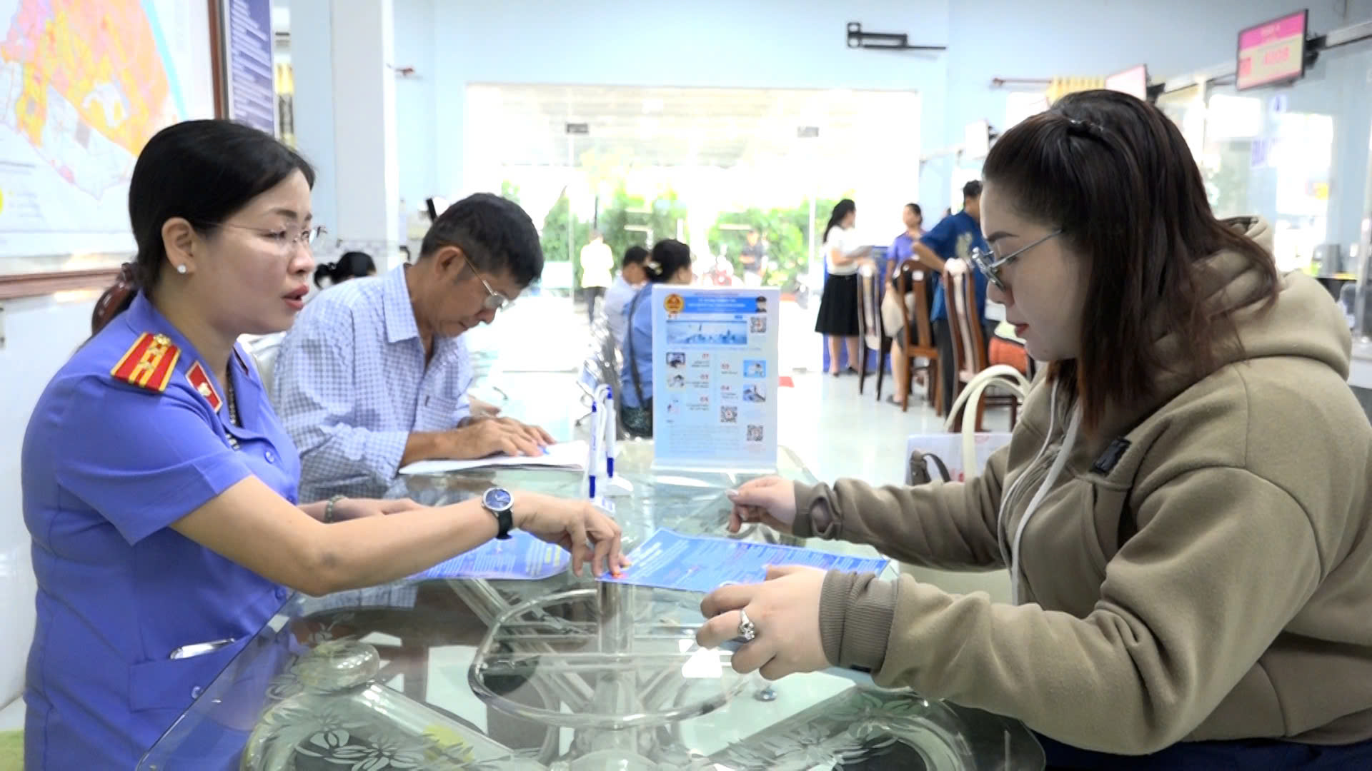 Cán bộ Viện Kiểm sát nhân dân khu vực 3 Cần Thơ cấp phát tờ rơi tuyên truyền Nghị quyết 205/2025/QH15 và hướng dẫn người dân cung cấp thông tin.