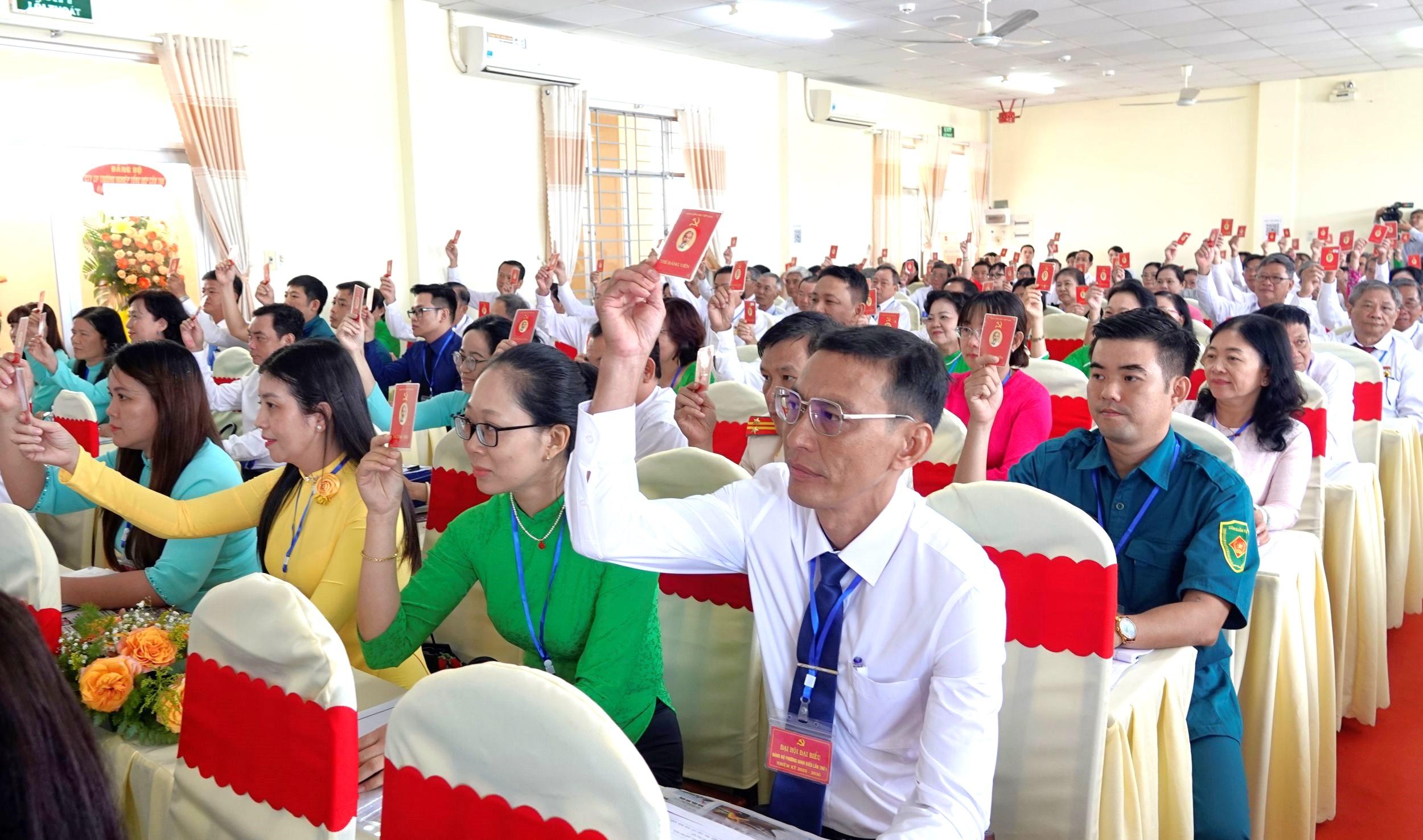Các đảng viên biểu quyết thông qua Nghị quyết ĐH đại biểu Đảng bộ phường Ninh Kiều.
