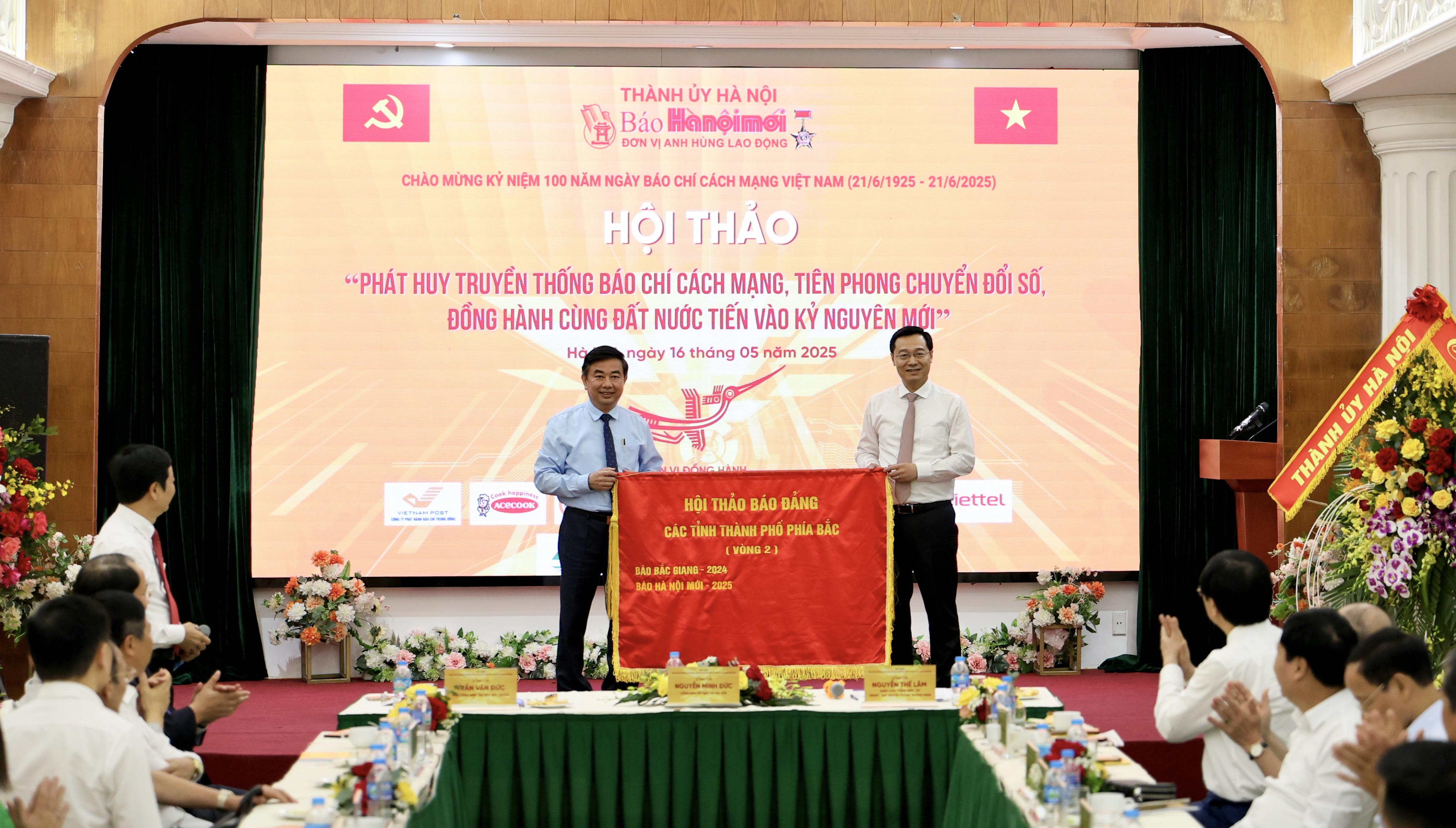 Tại hội thảo, lãnh đạo Báo Hà Nội Mới trao cờ luân lưu cho đơn vị đăng cai hội thảo báo Đảng các tỉnh, thành phố phía Bắc lần thứ 31, năm 2026 cho Trung tâm Trung tâm Truyền thông tỉnh Quảng Ninh.