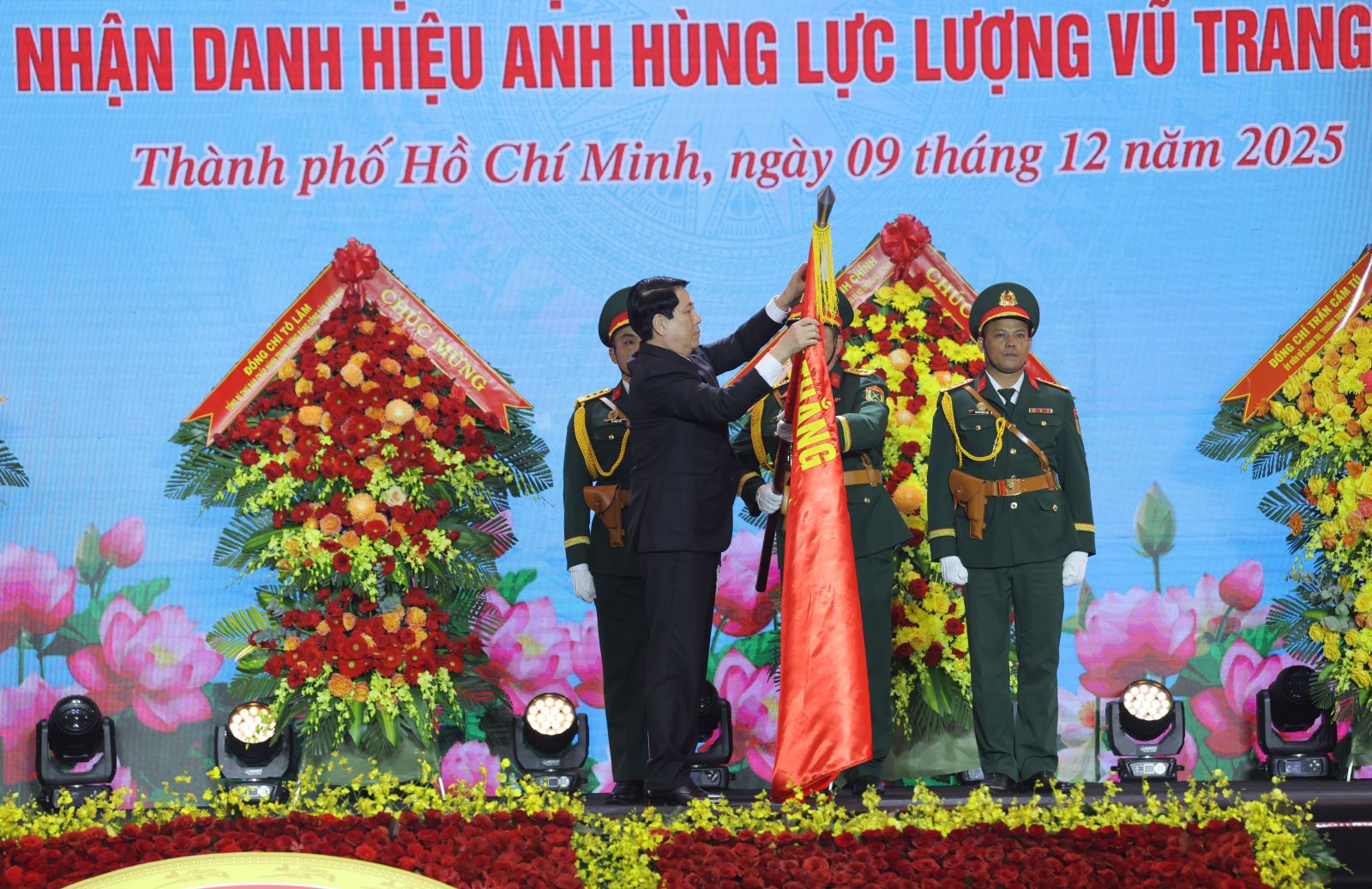 Chủ tịch nước Lương Cường trao danh hiệu Anh hùng Lực lượng vũ trang nhân dân tặng Quân khu 7. Ảnh: VPCTN