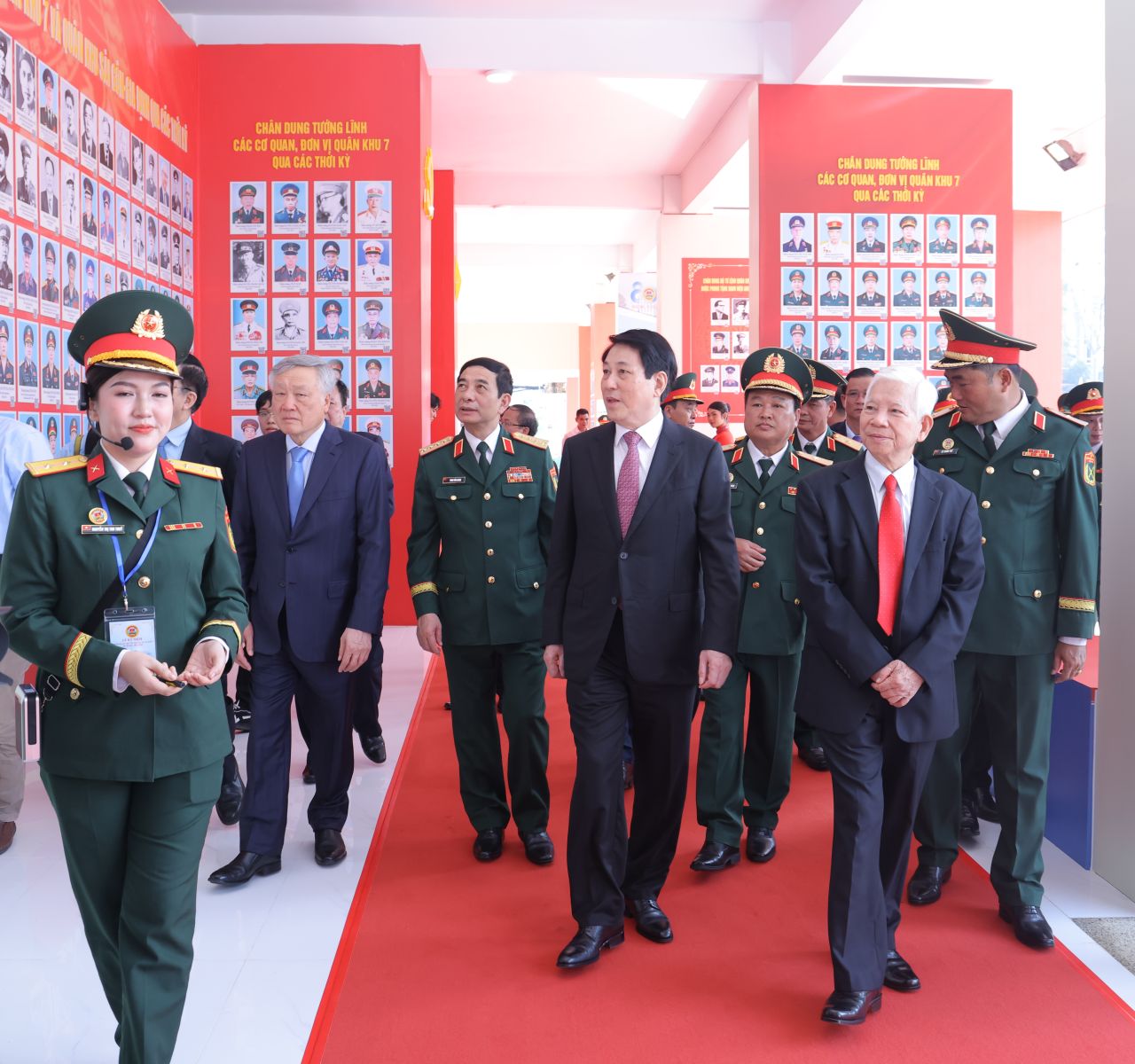 Chủ tịch nước Lương Cường và các đại biểu tham quan trưng bày kỷ niệm 80 năm Ngày truyền thống Lực lượng vũ trang Quân khu 7. Ảnh: VPCTN