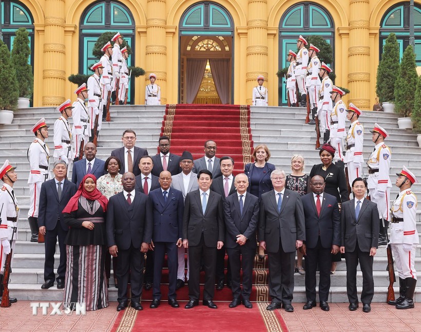 Chủ tịch nước Lương Cường với các Đại sứ đến trình Quốc thư. (Ảnh: Lâm Khánh/TTXVN)