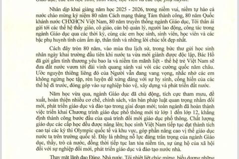 Nhân dịp khai giảng năm học 2025-2026, trong niềm vui, niềm tự hào cả nước chào mừng kỷ niệm 80 năm Cách mạng Tháng Tám thành công, 80 năm Quốc khánh nước Cộng hòa xã hội chủ nghĩa Việt Nam, 80 năm truyền thống ngành Giáo dục, Tôi thân ái gửi tới các thế hệ thầy giáo, cô giáo, cán bộ quản lý, người lao động công tác trong ngành Giáo dục qua các thời kỳ, cùng các em học sinh, sinh viên, học viên và các bậc phụ huynh tình cảm ấm áp, thân tình và những lời chúc tốt đẹp nhất.