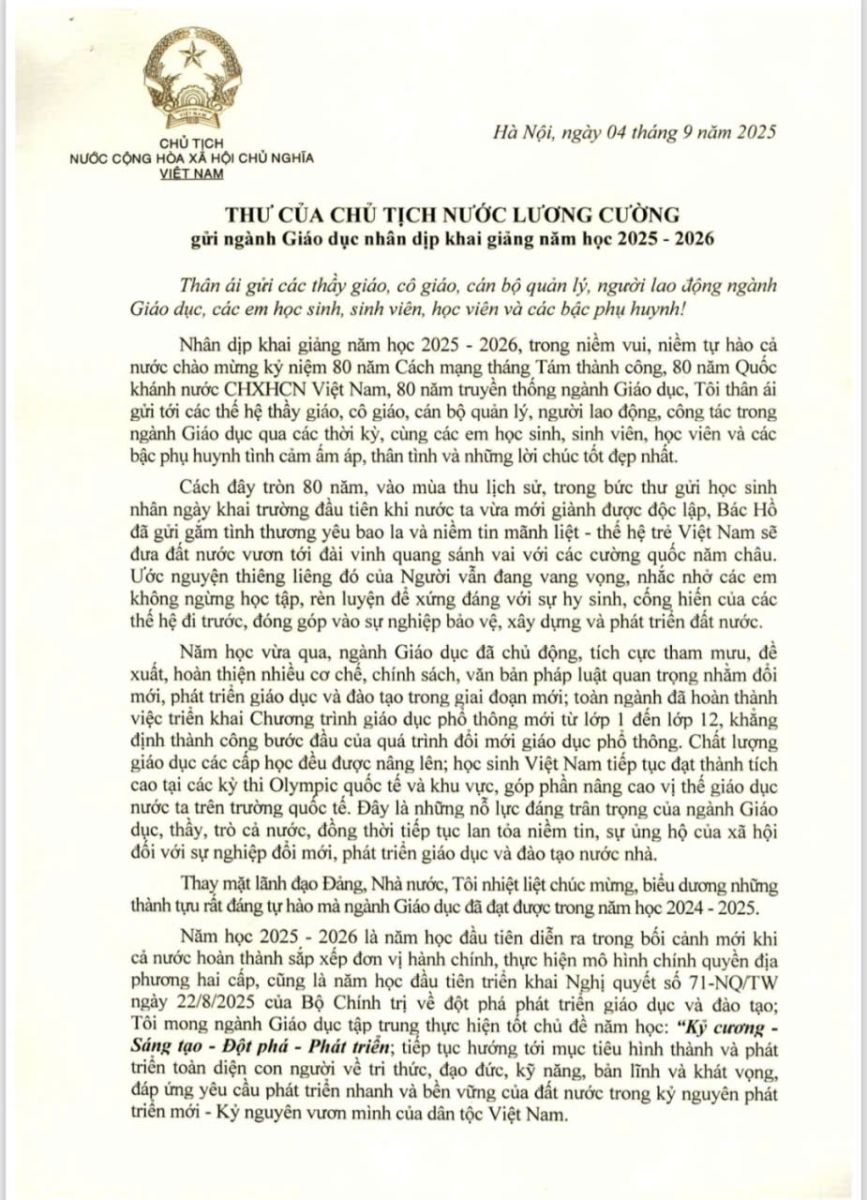 Nhân dịp khai giảng năm học 2025-2026, trong không khí hân hoan cả nước kỷ niệm 80 năm Cách mạng Tháng Tám, Quốc khánh 2/9 và 80 năm truyền thống ngành Giáo dục, Chủ tịch nước Lương Cường đã gửi thư tới toàn ngành. Trang Thông tin điện tử Văn phòng Chủ tịch nước trân trọng giới thiệu toàn văn Thư của Chủ tịch nước: