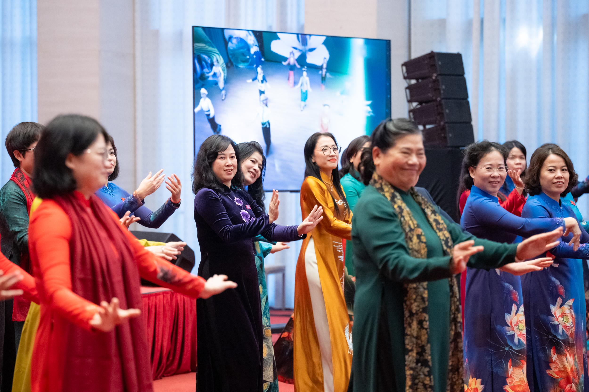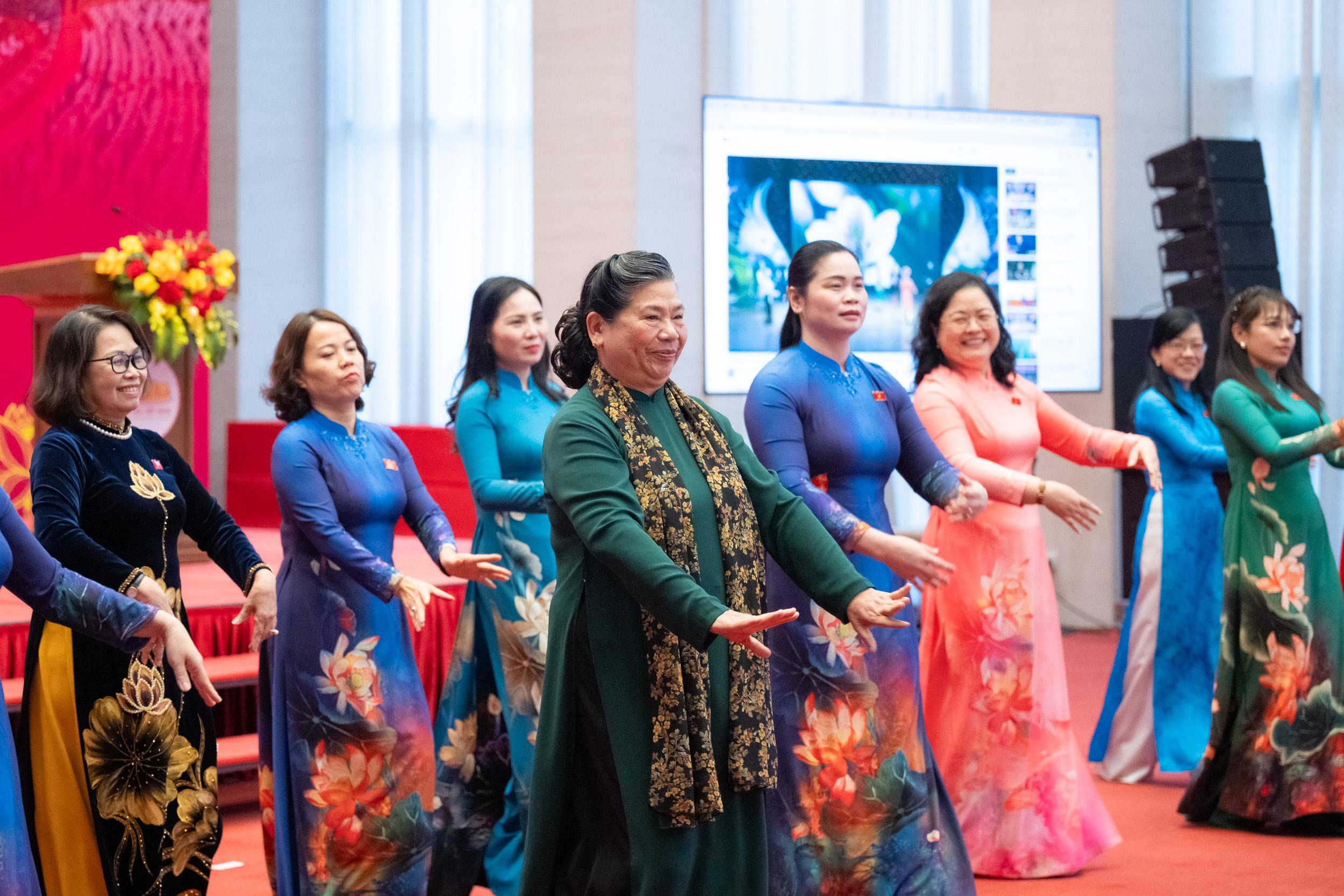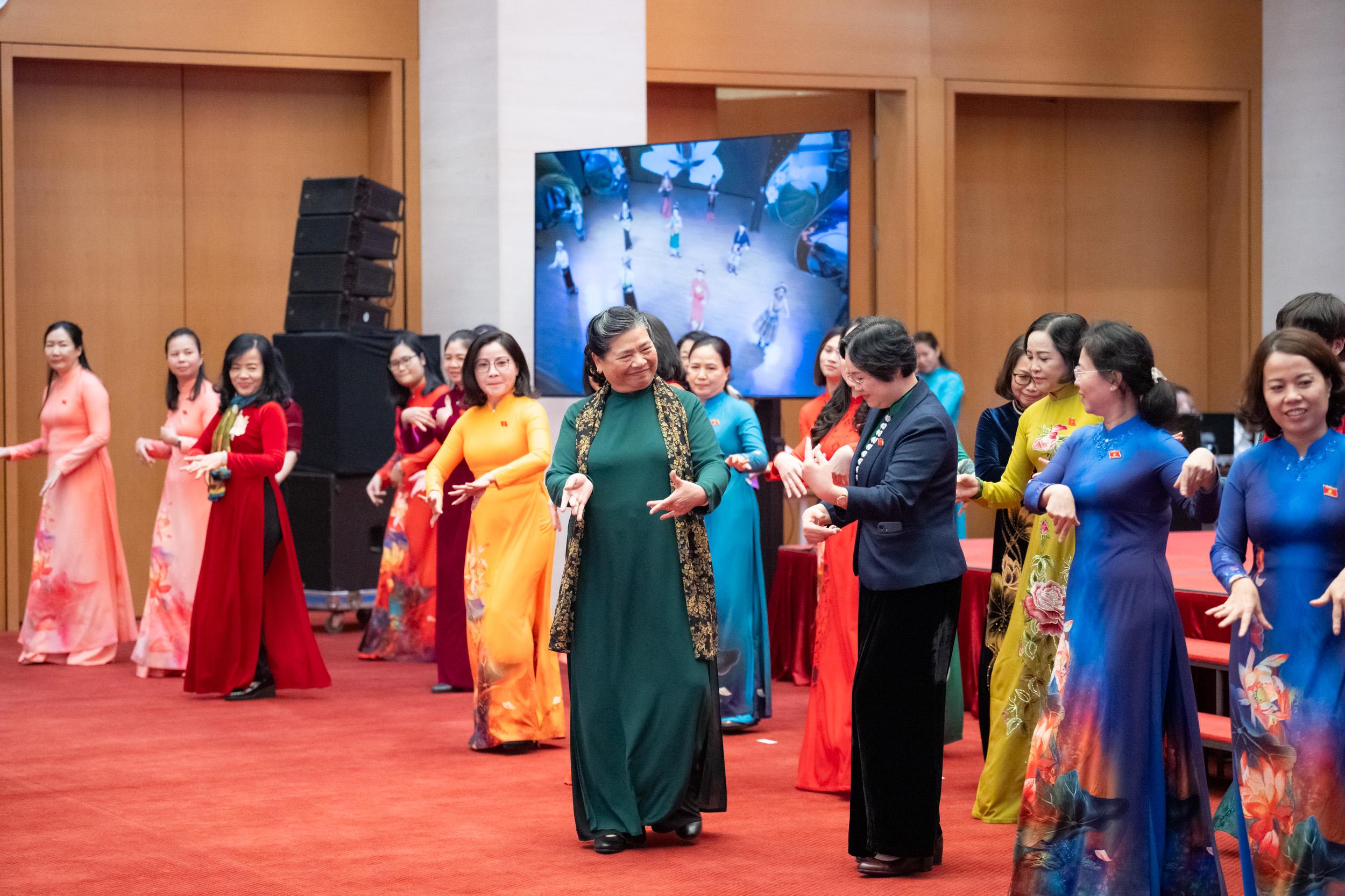 Nguyên Phó Chủ tịch Thương trực Quốc hội Tòng Thị Phóng và các nữ đại biểu Quốc hội cùng "Vũ điệu Kết đoàn"