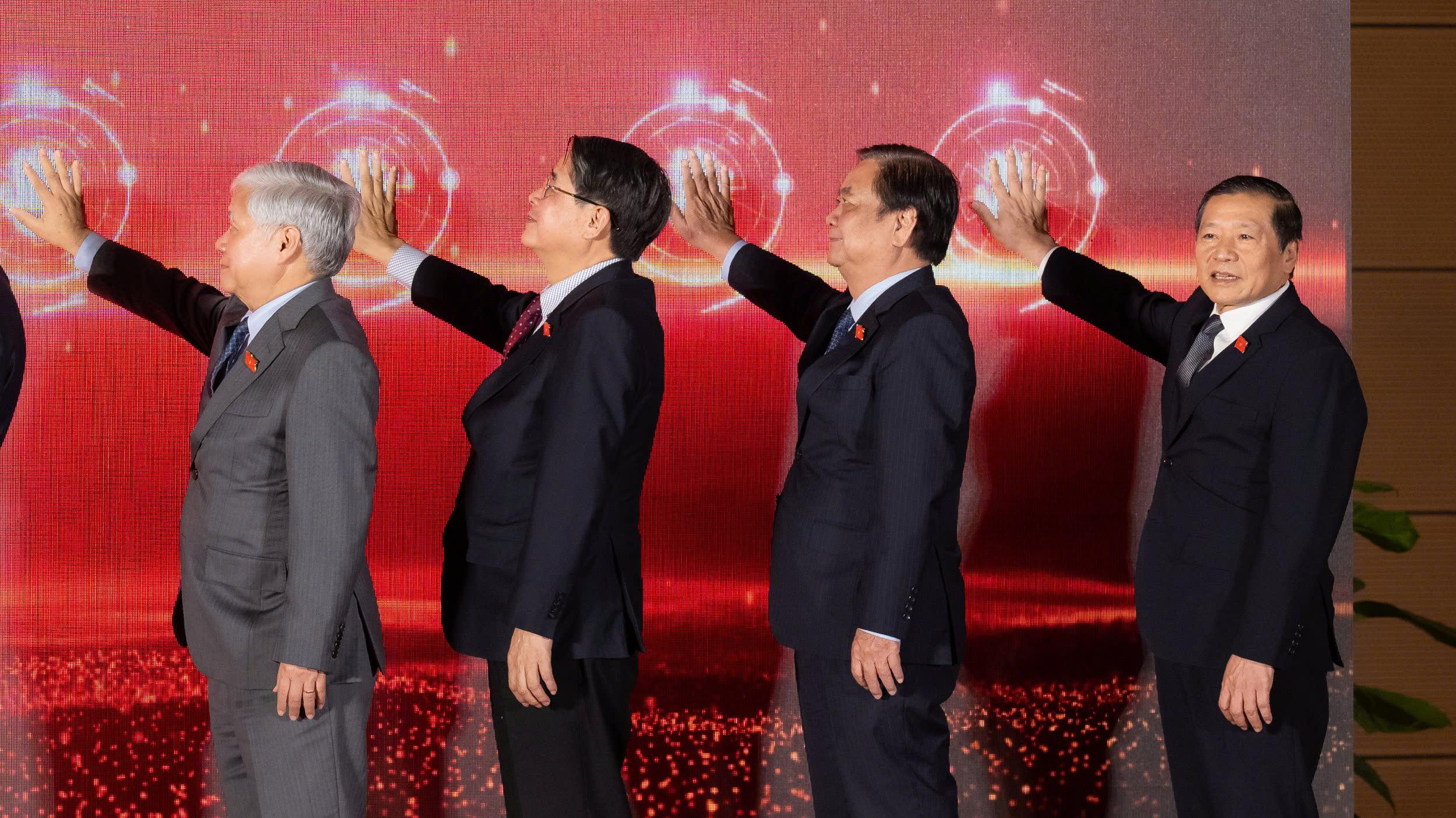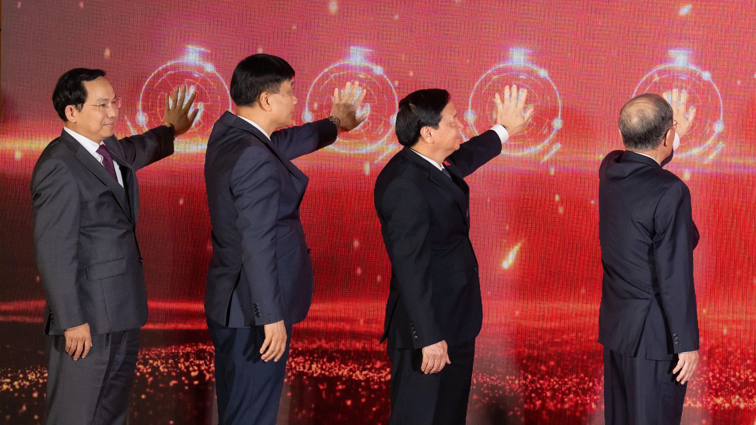Chủ tịch Quốc hội Trần Thanh Mẫn, nguyên Tổng Bí thư Nông Đức Mạnh và các đồng chí lãnh đạo thực hiện Nghi thức Khai trương Bảo tàng Quốc hội Việt Nam