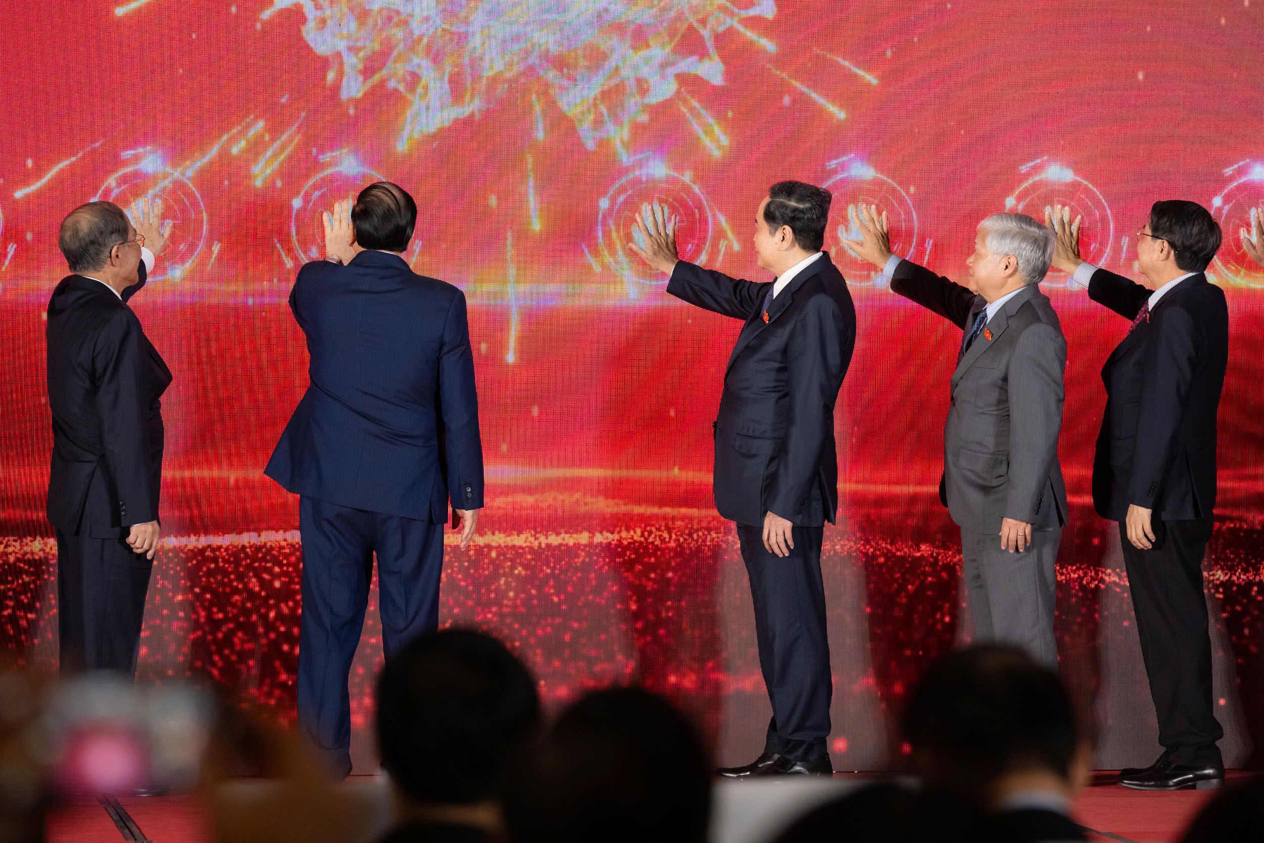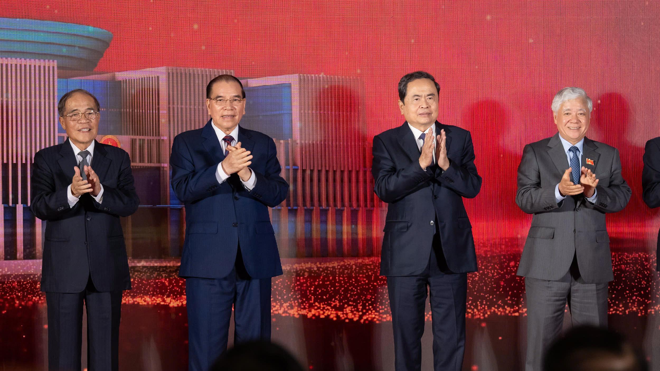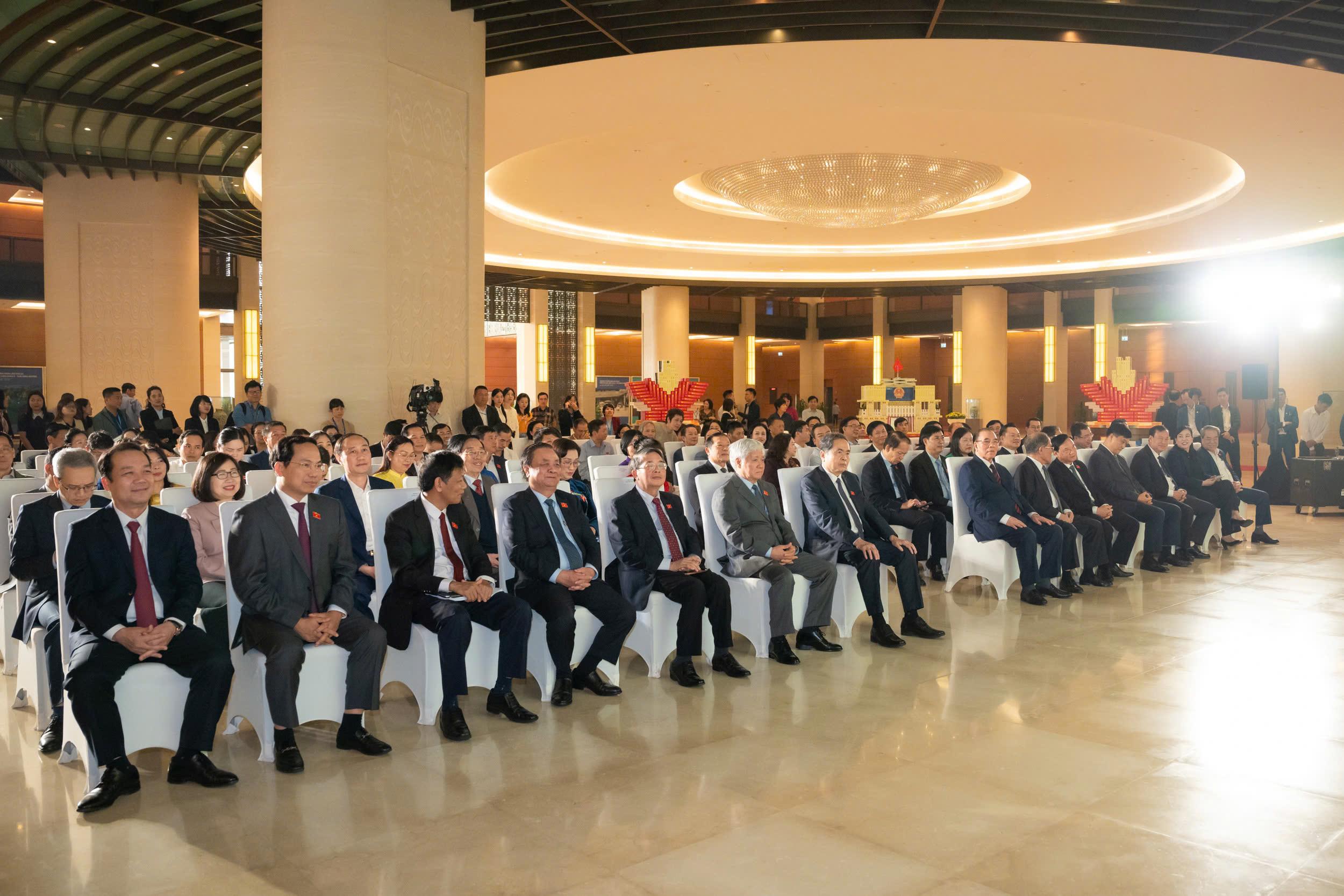 Chủ tịch Quốc hội Trần Thanh Mẫn; nguyên Tổng Bí thư, nguyên Chủ tịch Quốc hội Nông Đức Mạnh và các đồng chí lãnh đạo dự Lễ khai trương Bảo tàng Quốc hội Việt Nam và Lễ công bố các bộ sách, ấn phẩm và phát hành bộ tem bưu chính Kỷ niệm 80 năm Quốc hội Việt Nam