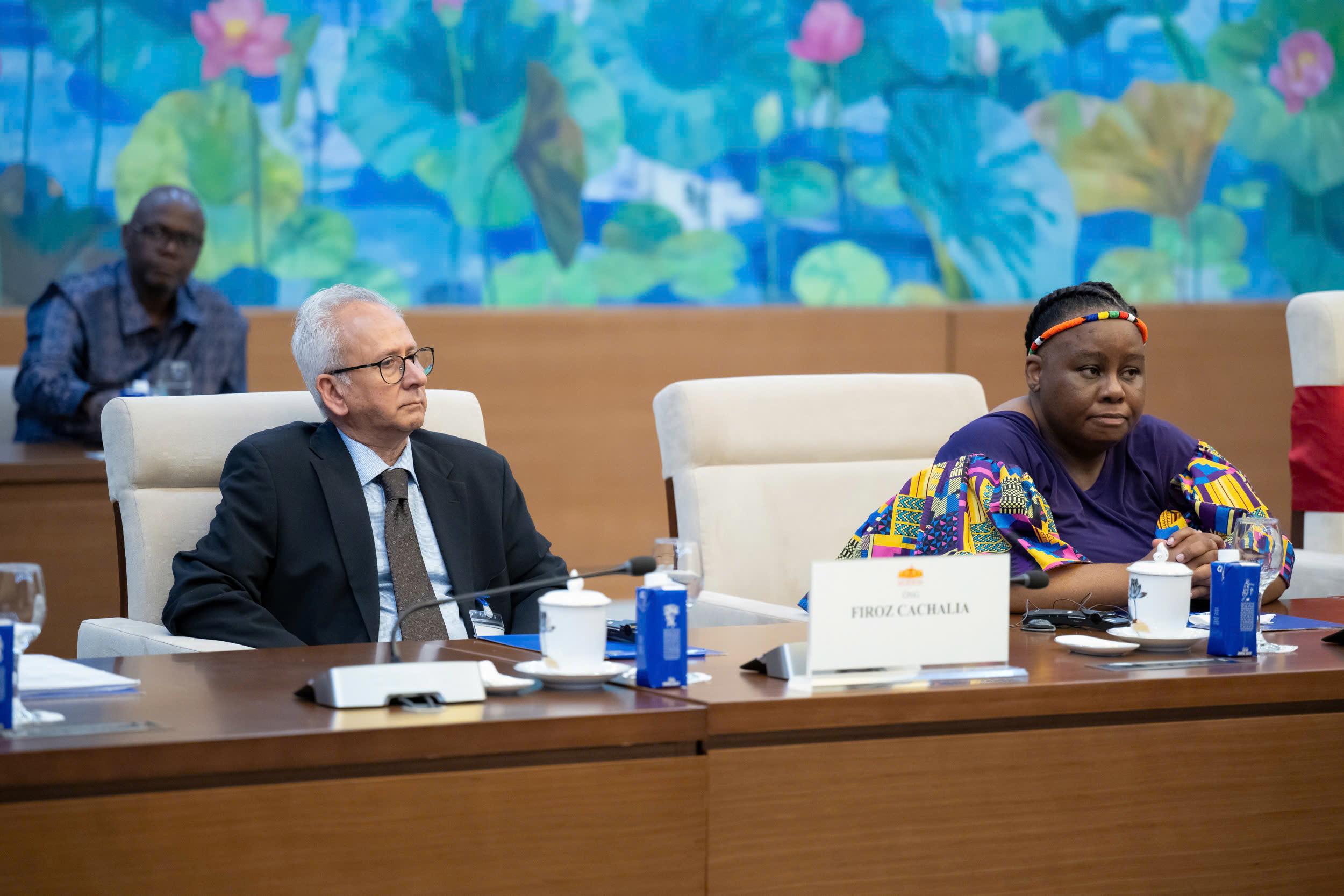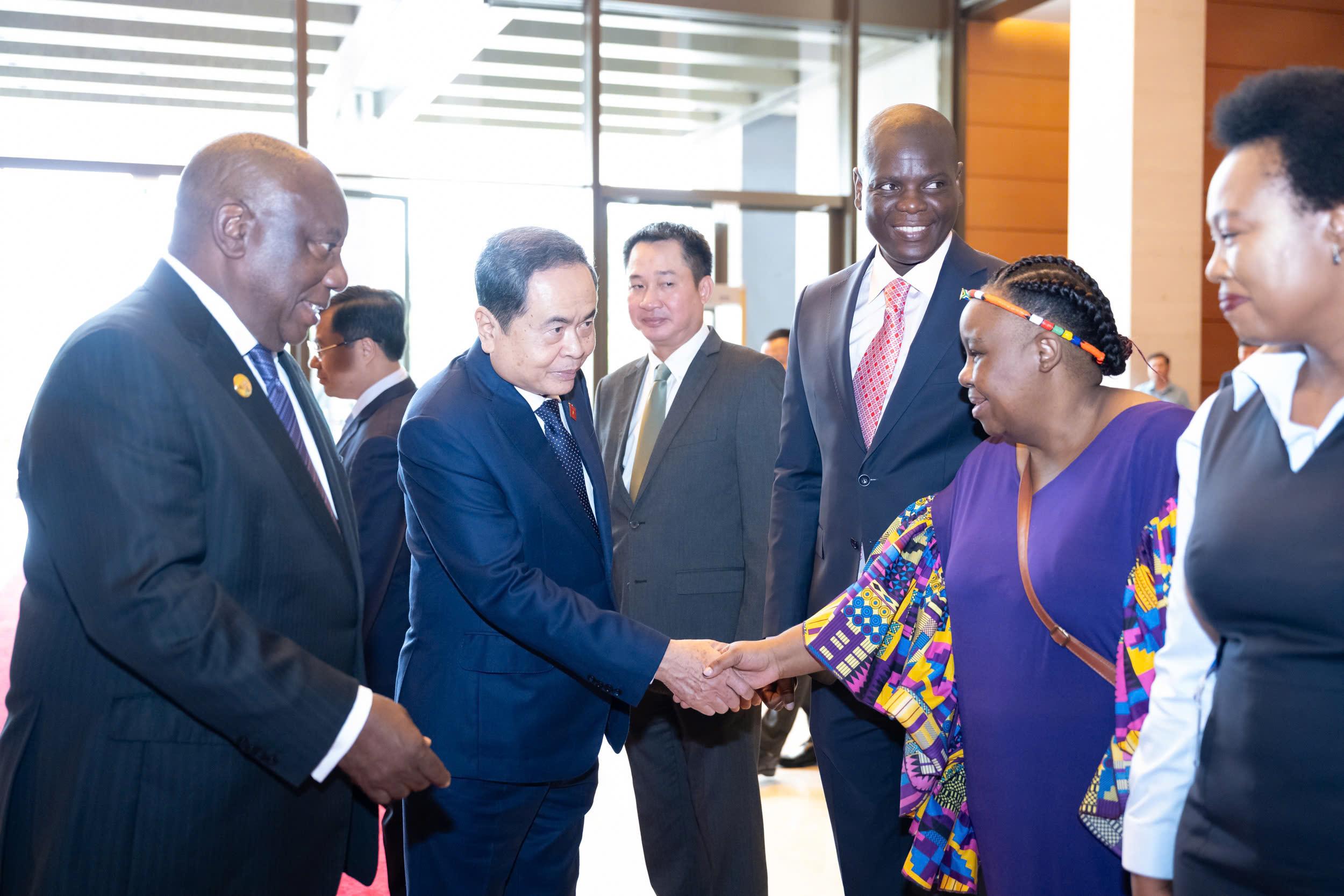 Tổng thống Nam Phi Matamela Cyril Ramaphosa giới thiệu với Chủ tịch Quốc hội Trần Thanh Mẫn các đại biểu phía Nam Phi