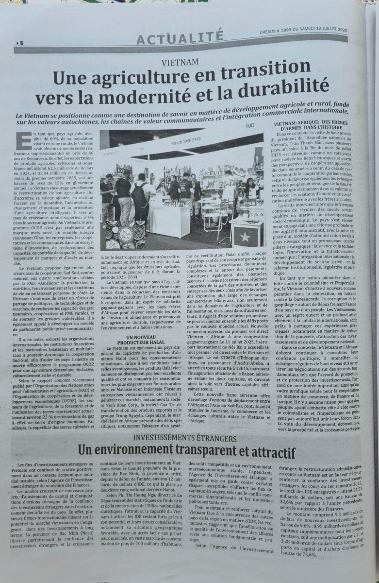 Phóng viên TTXVN tại Algeria đã điểm qua một số nội dung nổi bật của bài viết. Tờ nhật báo khẳng định Việt Nam đang trở thành một “điểm đến tri thức” trong phát triển nông nghiệp và nông thôn, dựa trên giá trị bản địa, chuỗi giá trị cộng đồng và hội nhập thương mại quốc tế.