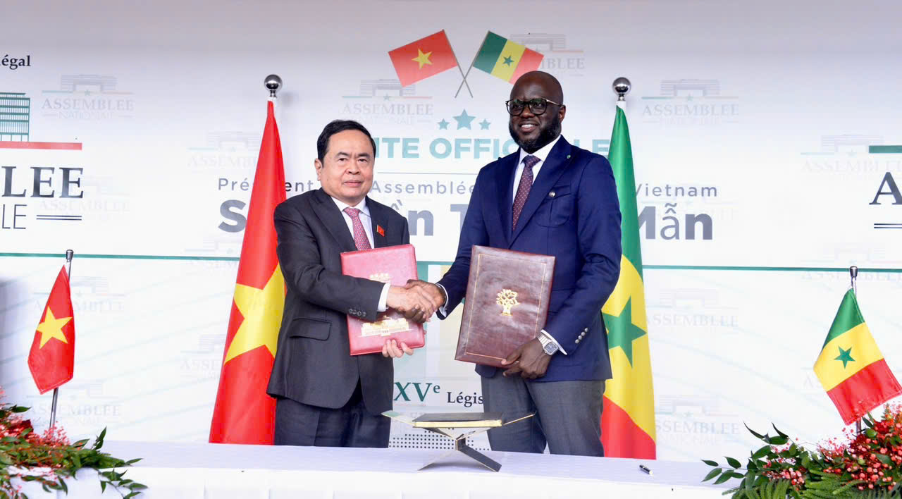 Chủ tịch Quốc hội Trần Thanh Mẫn và Chủ tịch Quốc hội Senegal El Malick Ndiaye trao bản ký thỏa thuận hợp tác giữa Quốc hội hai nước