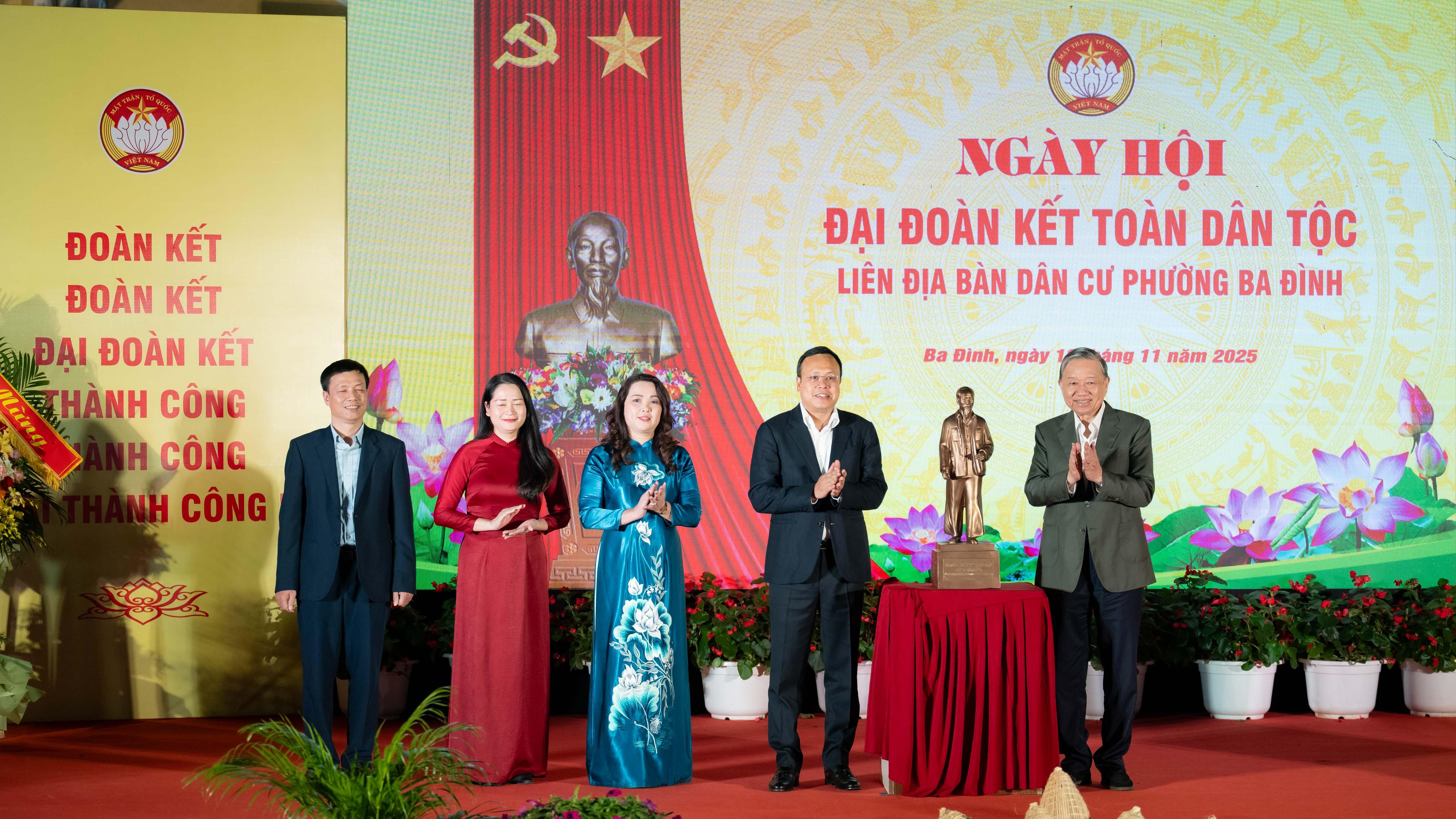 Trong không khí vui tươi, ấm áp của Ngày hội Đại đoàn kết toàn dân tộc, Tổng Bí thư Tô Lâm đã trao bức tượng Bác Hồ về thăm quê tặng Đảng bộ, chính quyền và Nhân dân phường Ba Đình; trao quà tặng tập thể đơn vị tổ chức Ngày hội và 10 hộ gia đình chính sách trên địa bàn phường Ba Đình.