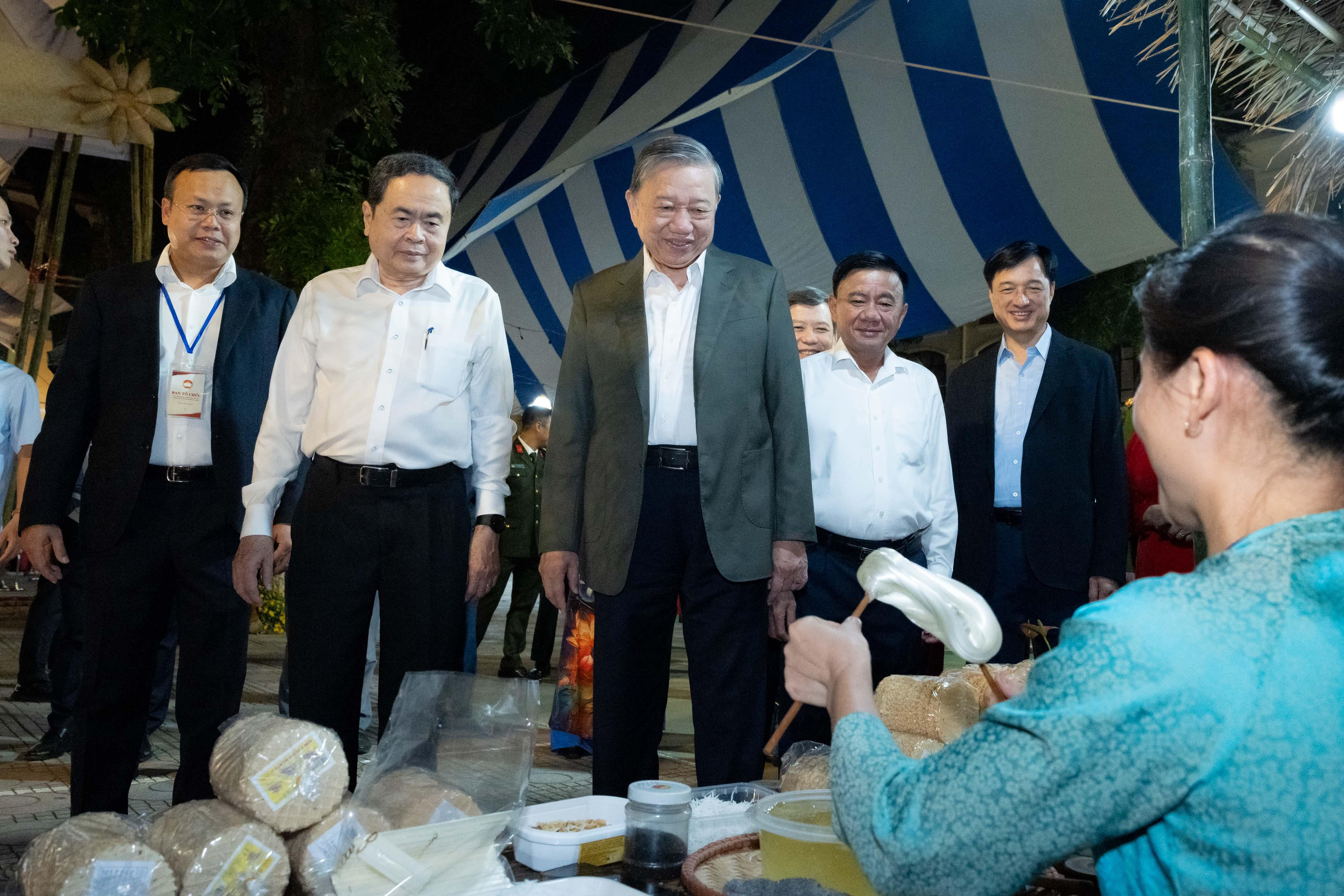 Tổng Bí thư Tô Lâm, Chủ tịch Quốc hội Trần Thanh Mẫn và các đại biểu tham quan các gian hàng trưng bày sản phẩm OCCOP tại Ngày hội