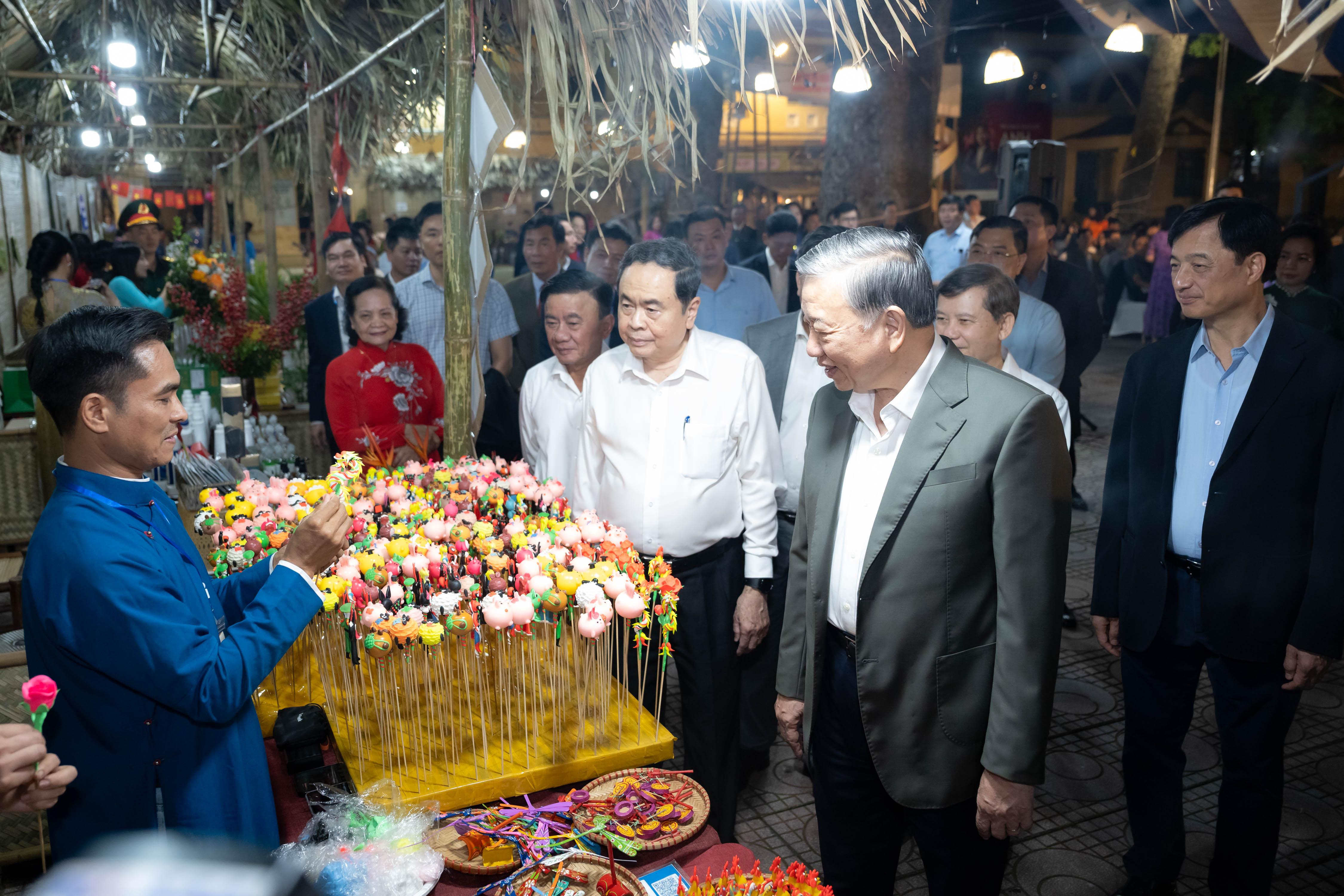 Tổng Bí thư Tô Lâm, Chủ tịch Quốc hội Trần Thanh Mẫn và các đại biểu tham quan các gian hàng trưng bày sản phẩm OCOP tại Ngày hội