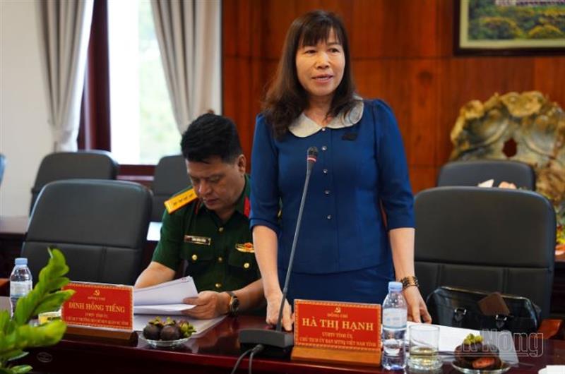 | Đồng chí Hà Thị Hạnh, Ủy viên BTVTU, Chủ tịch Ủy Ban Mặt trận tổ quốc Việt Nam tỉnh nêu ý kiến về tình hình hoạt động của các tín đồ tôn giáo, dân tộc và đội ngũ cốt cán trên địa bàn tỉnh tương đối ổn định |