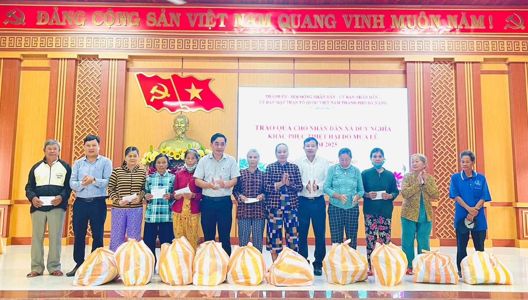 Trưởng ban Tổ chức Thành ủy Đoàn Duy Tân tặng quà người dân vùng lũ xã Nam Phước và Duy Nghĩa