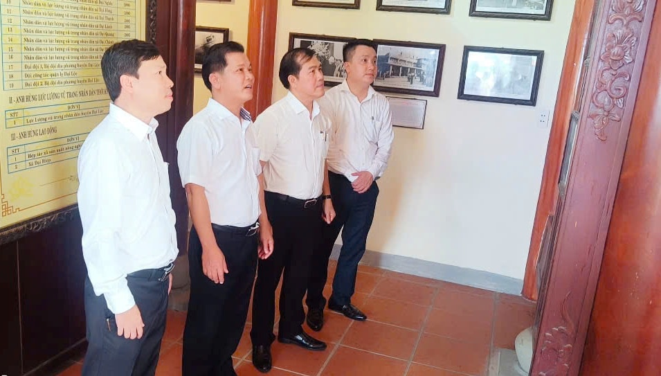 Phó Trưởng ban Thường trực Ban Tổ chức Thành ủy Nguyễn Đức Nam (thứ 2 từ phải sang) thăm Nhà lưu niệm nơi thành lập Đảng bộ huyện Đại Lộc. Ảnh: HÀ NHA