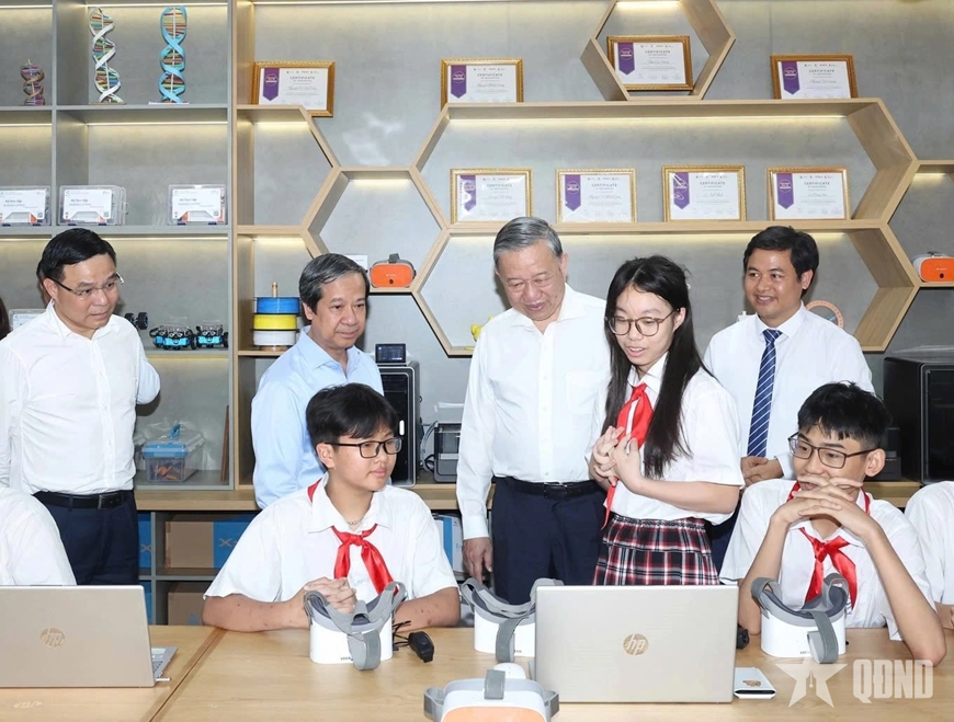 Tổng Bí thư Tô Lâm thăm phòng thực hành STEM của Trường Trung học cơ sở Cầu Giấy, Hà Nội, ngày 14-5-2025. Ảnh THỐNG NHẤT