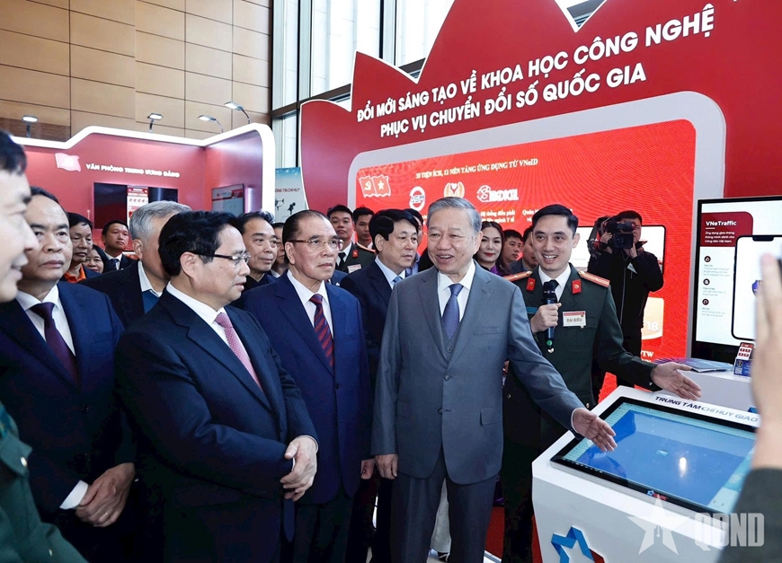 Các đồng chí lãnh đạo Đảng, Nhà nước tham quan các gian hàng trưng bày tại Hội nghị toàn quốc về đột phá phát triển khoa học, công nghệ, đổi mới sáng tạo và chuyển đổi số quốc gia, tháng 1-2025 Ảnh: VIẾT THÀNH