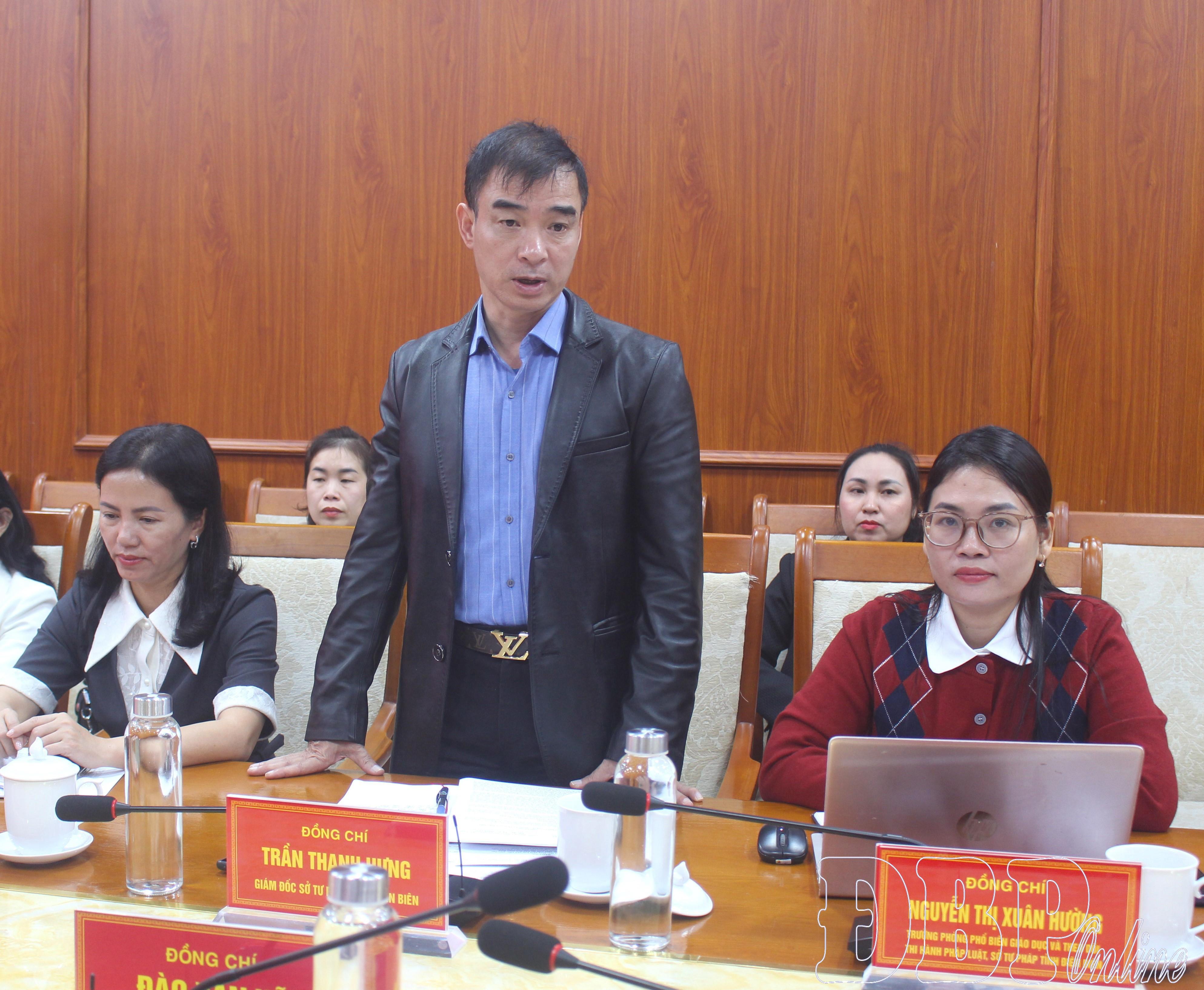 Đồng chí Trần Thanh Hưng, Phó Chủ tịch Thường trực Hội đồng phối hợp PBGDPL tỉnh, Giám đốc Sở Tư pháp phát biểu tại buổi trao đổi.