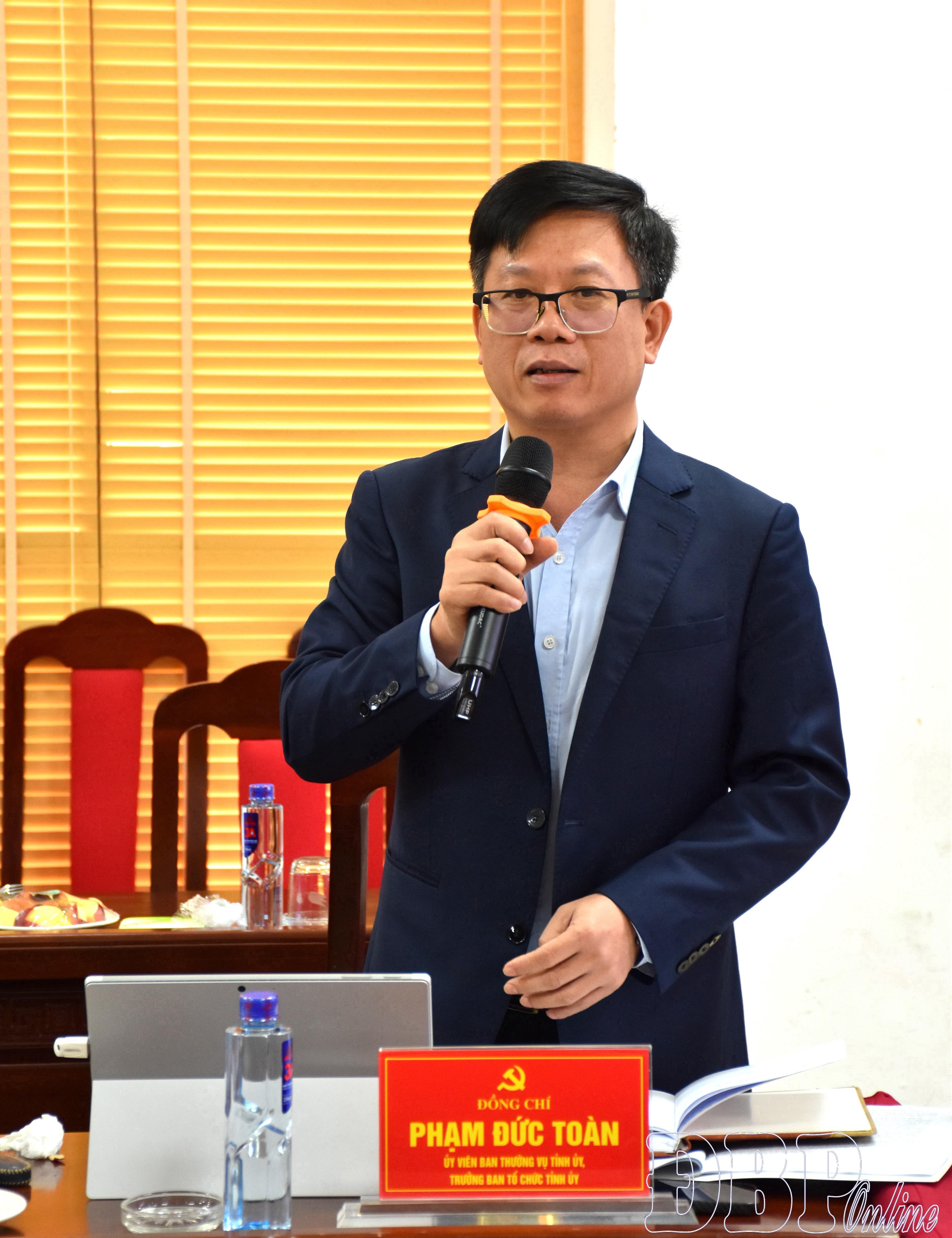 Đồng chí Phạm Đức Toàn, Ủy viên BTV, Trưởng ban Tổ chức Tỉnh ủy phát biểu ý kiến tại buổi làm việc.