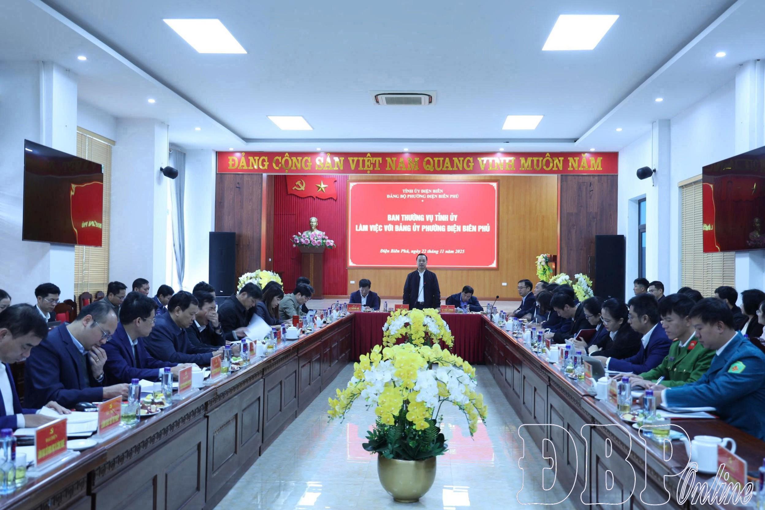 Sáng ngày 22/11, Ban Thường vụ Tỉnh ủy làm việc với Đảng ủy phường Điện Biên Phủ, nghe báo cáo kết quả thực hiện nhiệm vụ từ đầu năm đến nay; phương hướng, nhiệm vụ trọng tâm những tháng cuối năm 2025. Dự buổi làm việc có các đồng chí: Trần Tiến Dũng, Bí thư Tỉnh ủy; Lê Thành Đô, Phó Bí thư Thường trực Tỉnh ủy, Chủ tịch HĐND tỉnh; Lê Văn Lương, Phó Bí thư Tỉnh ủy, Chủ tịch UBND tỉnh; các đồng chí Ban Thường vụ Tỉnh ủy, Ban Chấp hành Đảng bộ tỉnh; đại diện lãnh đạo một số sở, ngành tỉnh.