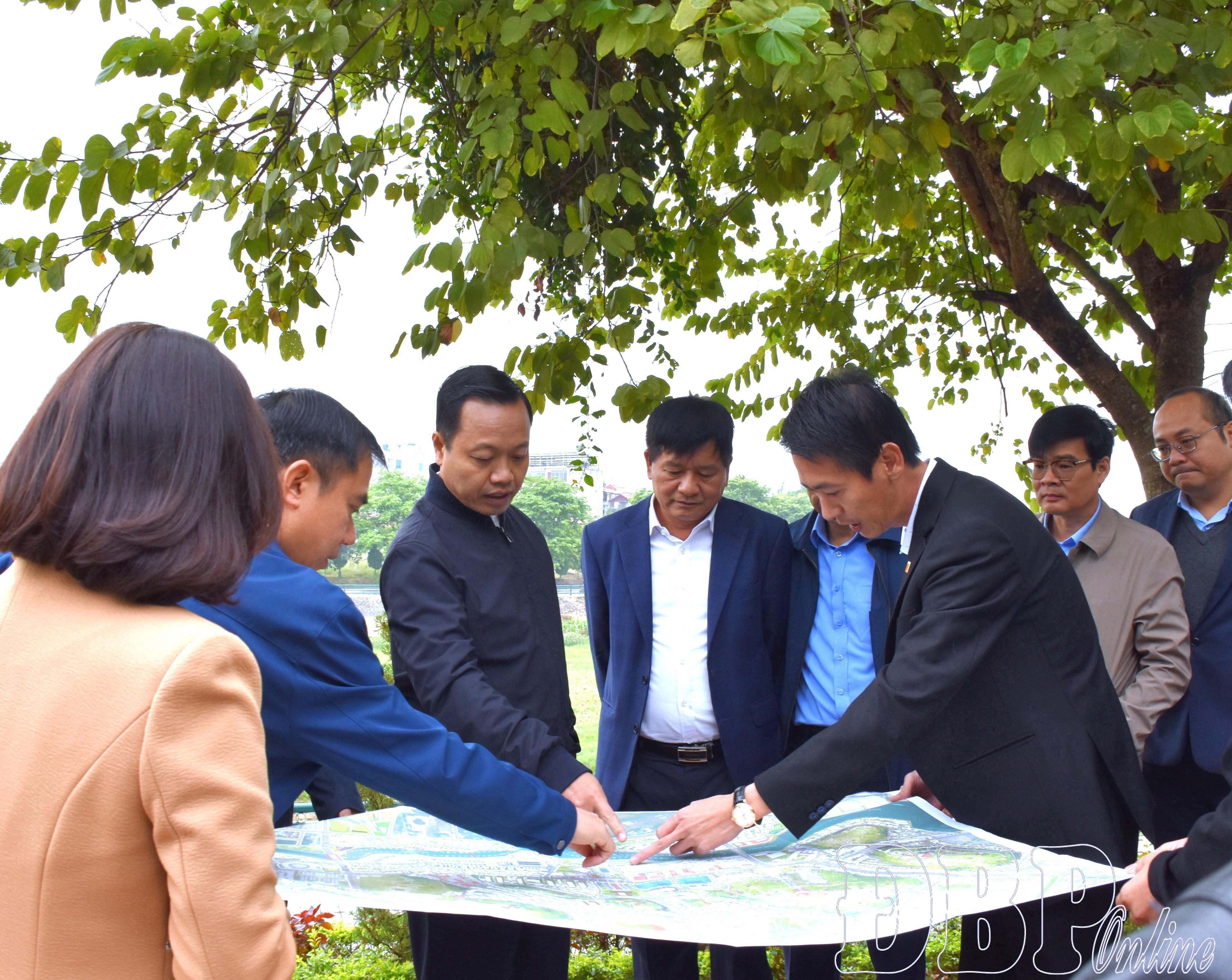 Bí thư Tỉnh ủy Trần Tiến Dũng và các đồng chí lãnh đạo tỉnh khảo sát tuyến phố đi bộ, khu ẩm thực và kinh tế chợ đêm Mường Thanh trên bản đồ.