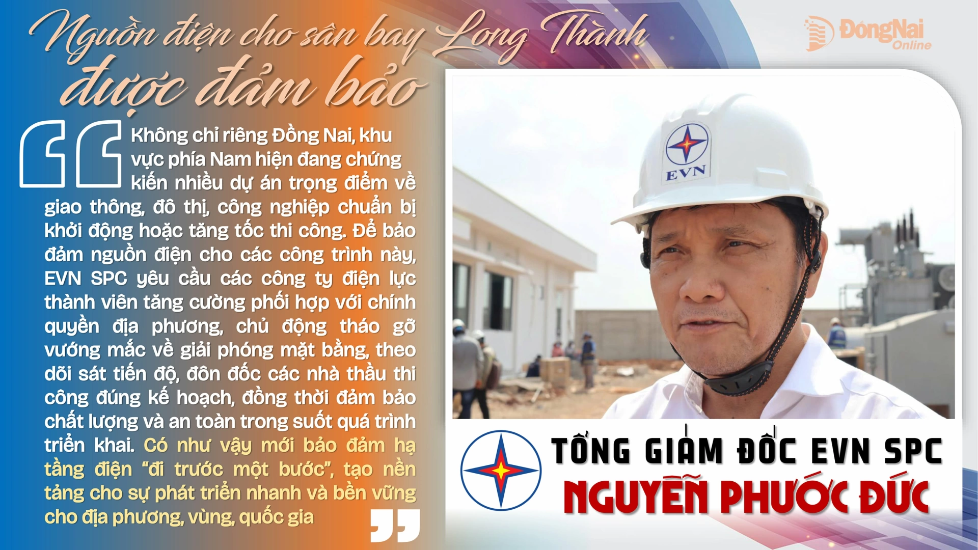 Đến thăm dự án Trạm biến áp 110kV Sân bay Long Thành và đường dây đấu nối vào thời điểm hoàn thành giai đoạn 1, Tổng giám đốc EVN SPC Nguyễn Phước Đức đã chia sẻ, EVN SPC đã chỉ đạo các đơn vị trực thuộc chủ động bảo đảm cung ứng điện ổn định, liên tục, đáp ứng yêu cầu phát triển kinh tế - xã hội tại các địa bàn phụ trách. Đối với công trình cung cấp điện cho Sân bay Long Thành, một trong những dự án hạ tầng quan trọng bậc nhất của cả nước, EVN SPC đã giao nhiệm vụ cụ thể cho PC Đồng Nai xây dựng kế hoạch chi tiết, phối hợp chặt chẽ với chính quyền và các đơn vị liên quan trong suốt quá trình triển khai. Nhờ sự vào cuộc đồng bộ, công trình đã hoàn thành theo đúng lộ trình, góp phần quan trọng giúp Sân bay Long Thành tiến đến mốc vận hành theo kế hoạch.