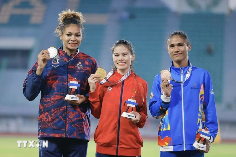 | Tuyển thủ Nguyễn Thị Ngọc xuất sắc giành chiến thắng trên đường chạy 400m nữ để trở thành nhà vô địch SEA Games 33. Ảnh: Minh Quyết/TTXVN |