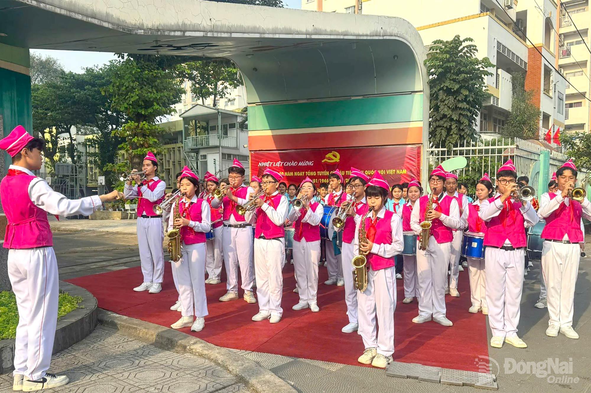 | Đội trống kèn Trường THCS Nguyễn Bỉnh Khiêm biểu diễn tại chương trình. Ảnh: Nhà thiếu nhi Đồng Nai cung cấp |