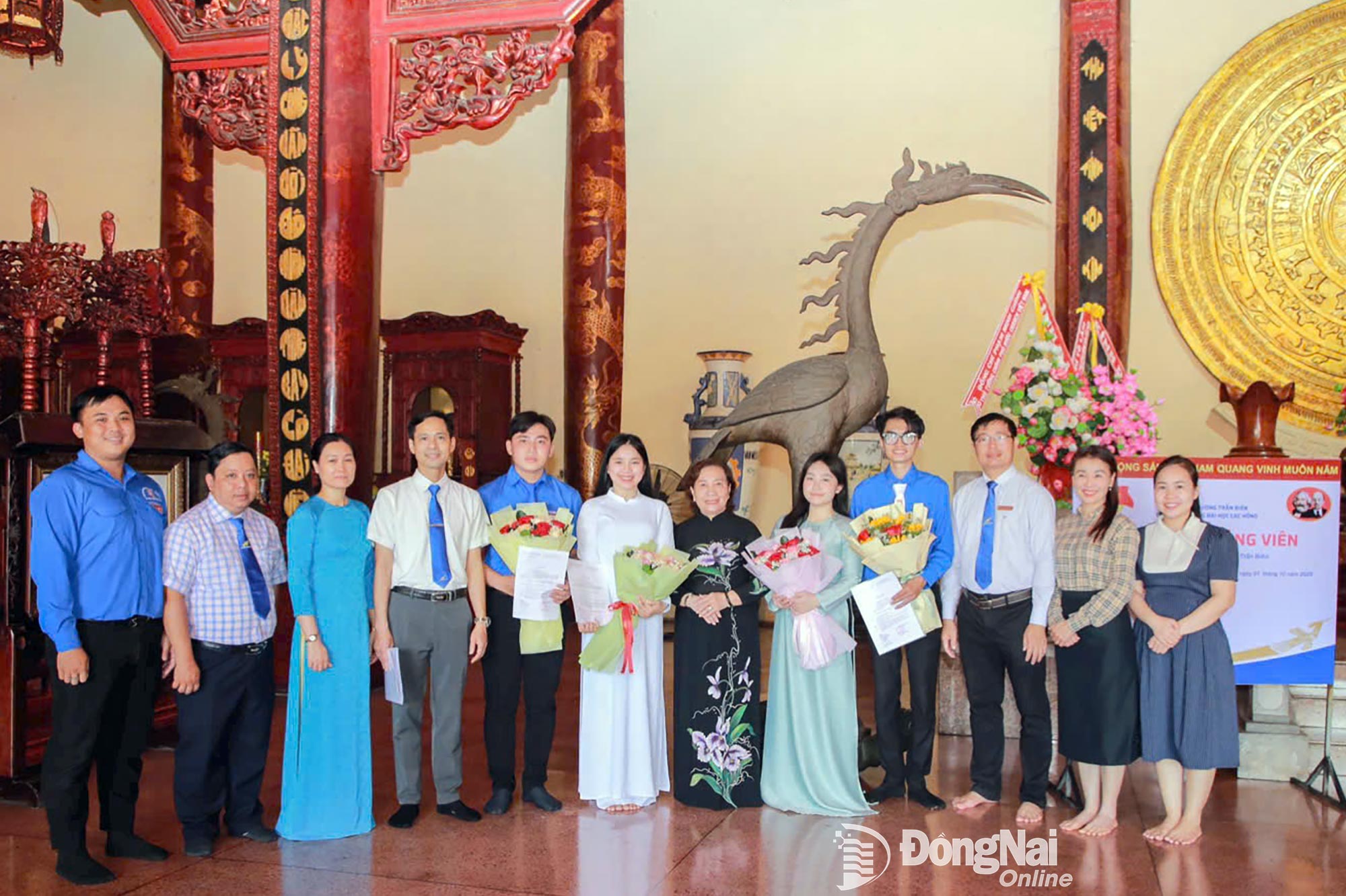 | Bà Nguyễn Thị Thu Lan, Bí thư Đảng ủy, Phó Hiệu trưởng Trường đại học Lạc Hồng tặng hoa chúc mừng 4 đảng viên mới kết nạp tại Văn miếu Trấn Biên. Ảnh: Bùi Cúc |