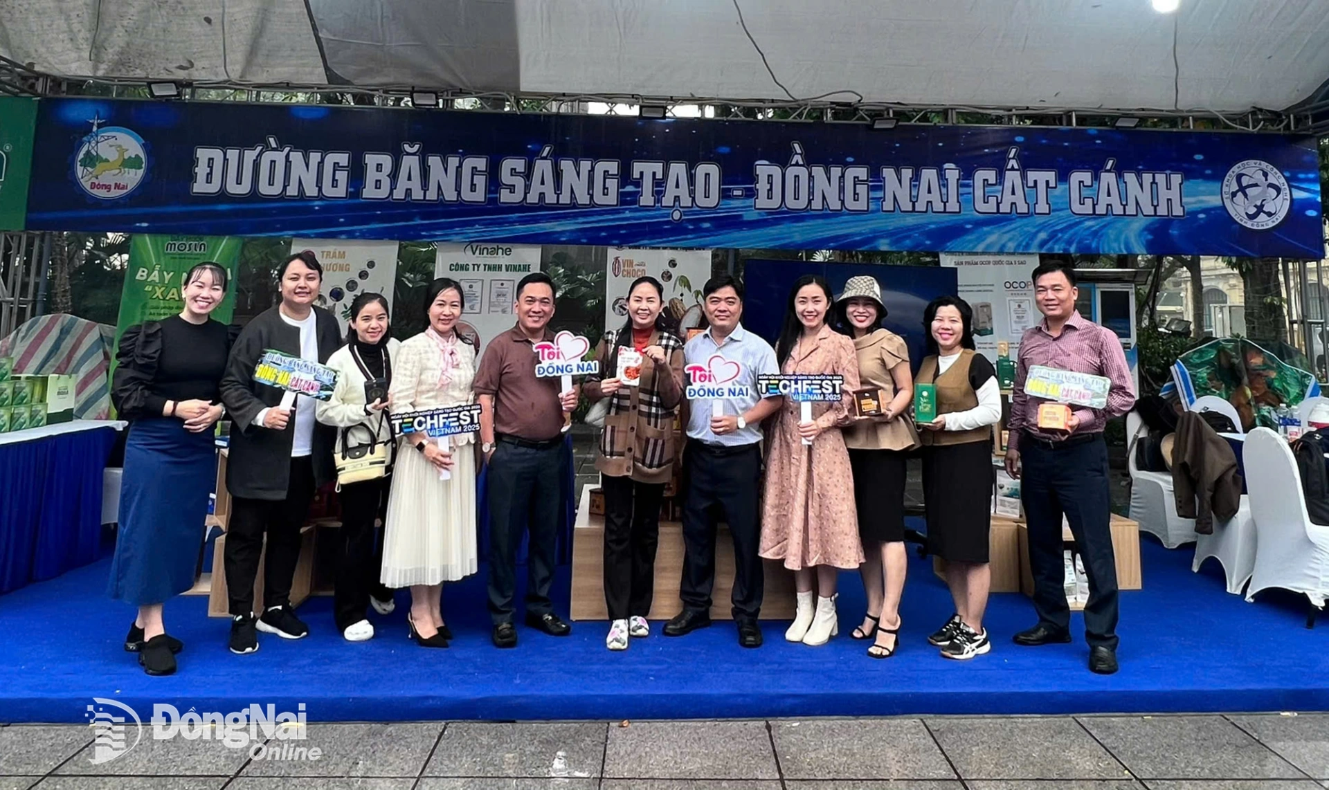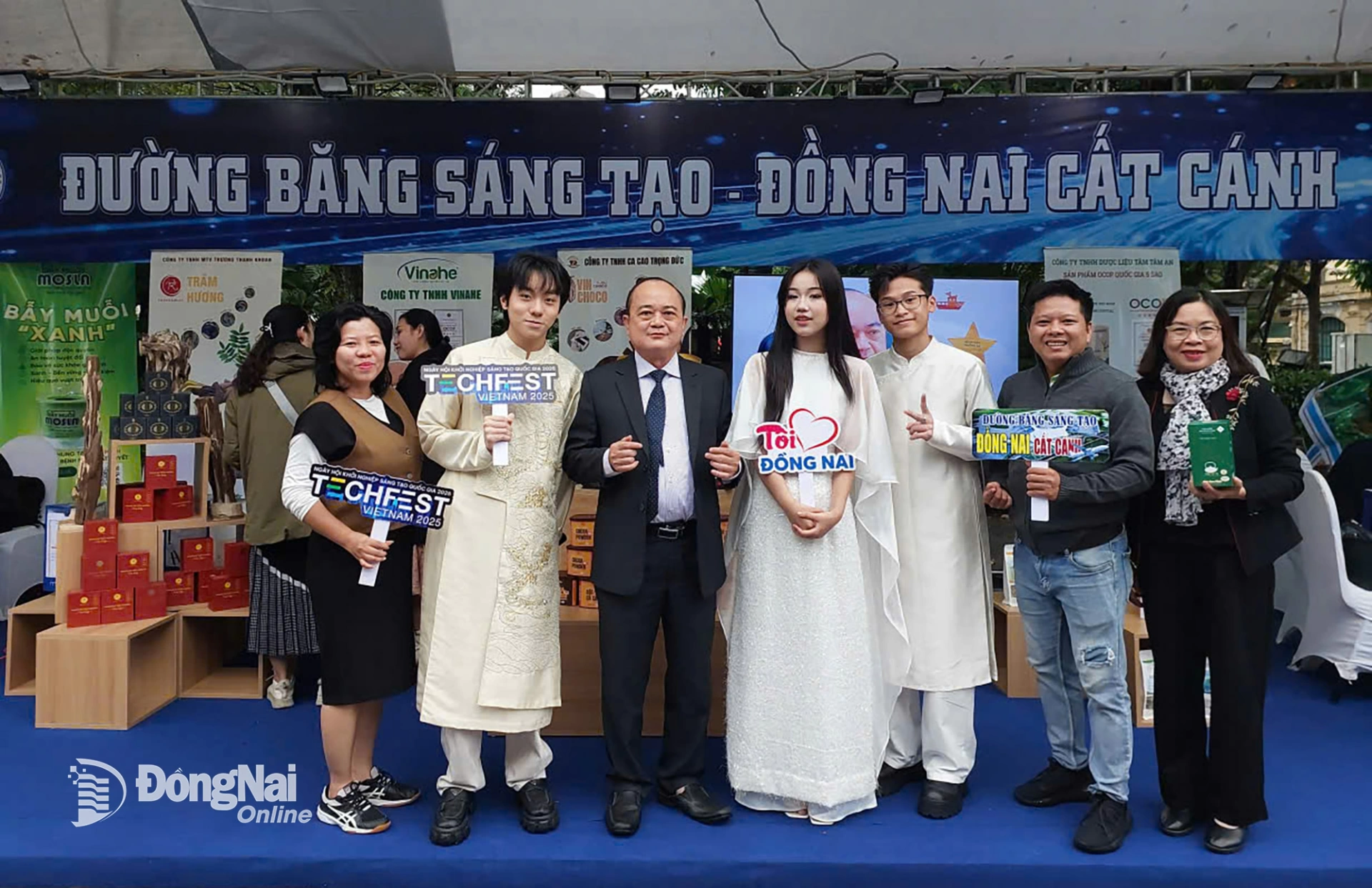 | Lãnh đạo Sở Khoa học và Công nghệ tỉnh Đồng Nai chụp ảnh cùng các bạn trẻ tại gian hàng trưng bày các sản phẩm tiêu biểu, sản phẩm khởi nghiệp, đổi mới sáng tạo của tỉnh Đồng Nai tại Techfest Việt Nam 2025. Ảnh: CTV |