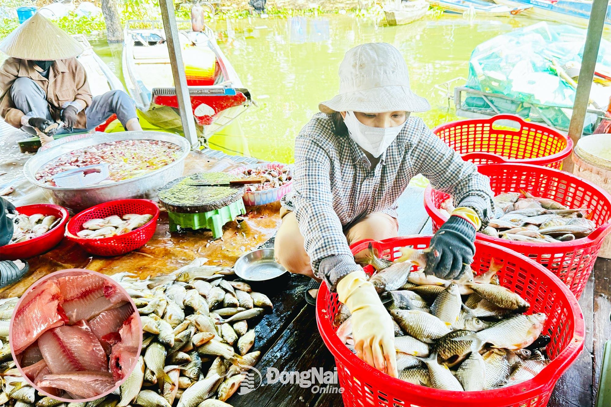 | Nguồn cá tươi được sơ chế ngay trên bè cá tại cơ sở của bà Lê Thị Cúc (ở ấp Suối Tượng, xã Trị An). |