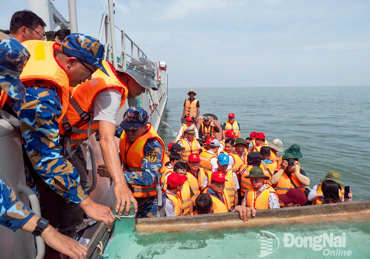 | Thượng tá Bùi Khánh Hòa, Phó Chỉ huy trưởng Bộ Chỉ huy Quân sự tỉnh Đồng Nai tặng quà các lực lượng trên đảo. Ảnh: Xuân Lượng |