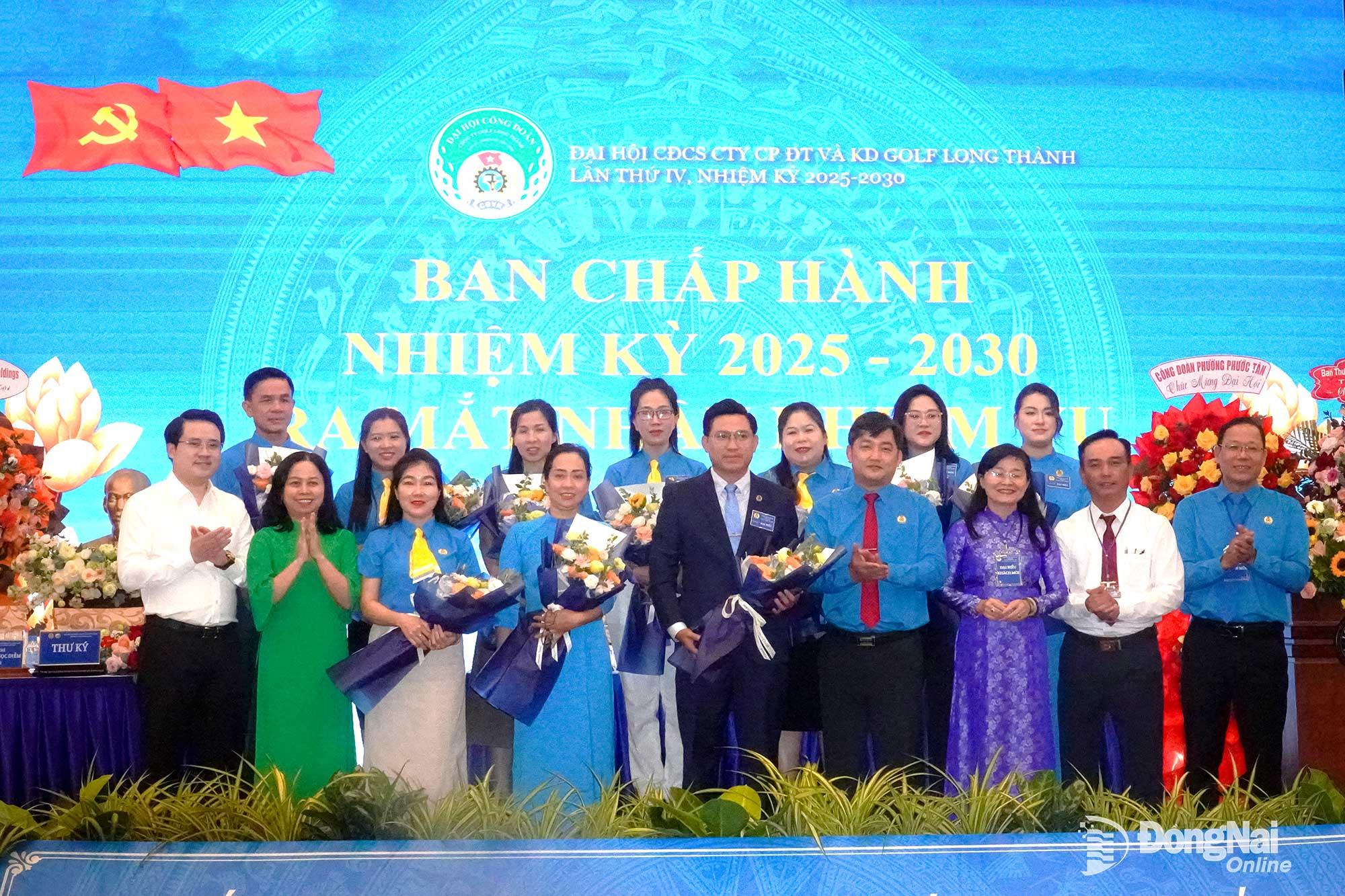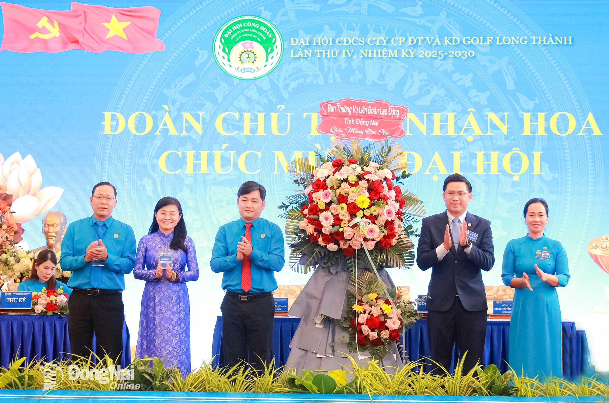 | Lãnh đạo Liên đoàn Lao động tỉnh và công ty tặng hoa chúc mừng Ban Chấp hành Công đoàn Công ty cổ phần Đầu tư và Phát triển Golf Long Thành nhiệm kỳ 2025-2030. Ảnh: N.Hòa |