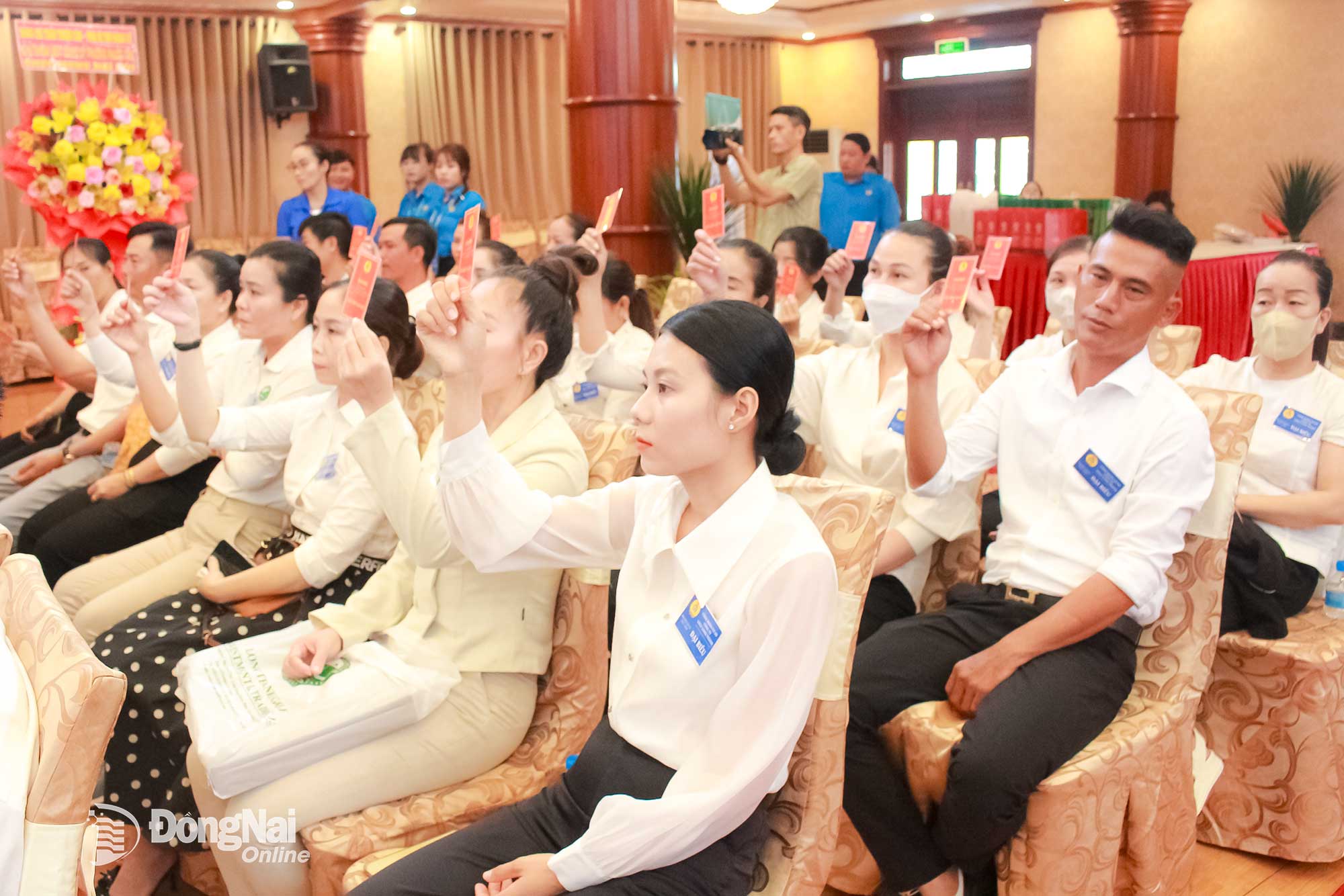 | Đại biểu biểu quyết thông các nghị quyết đại hội. Ảnh: N.Hòa |