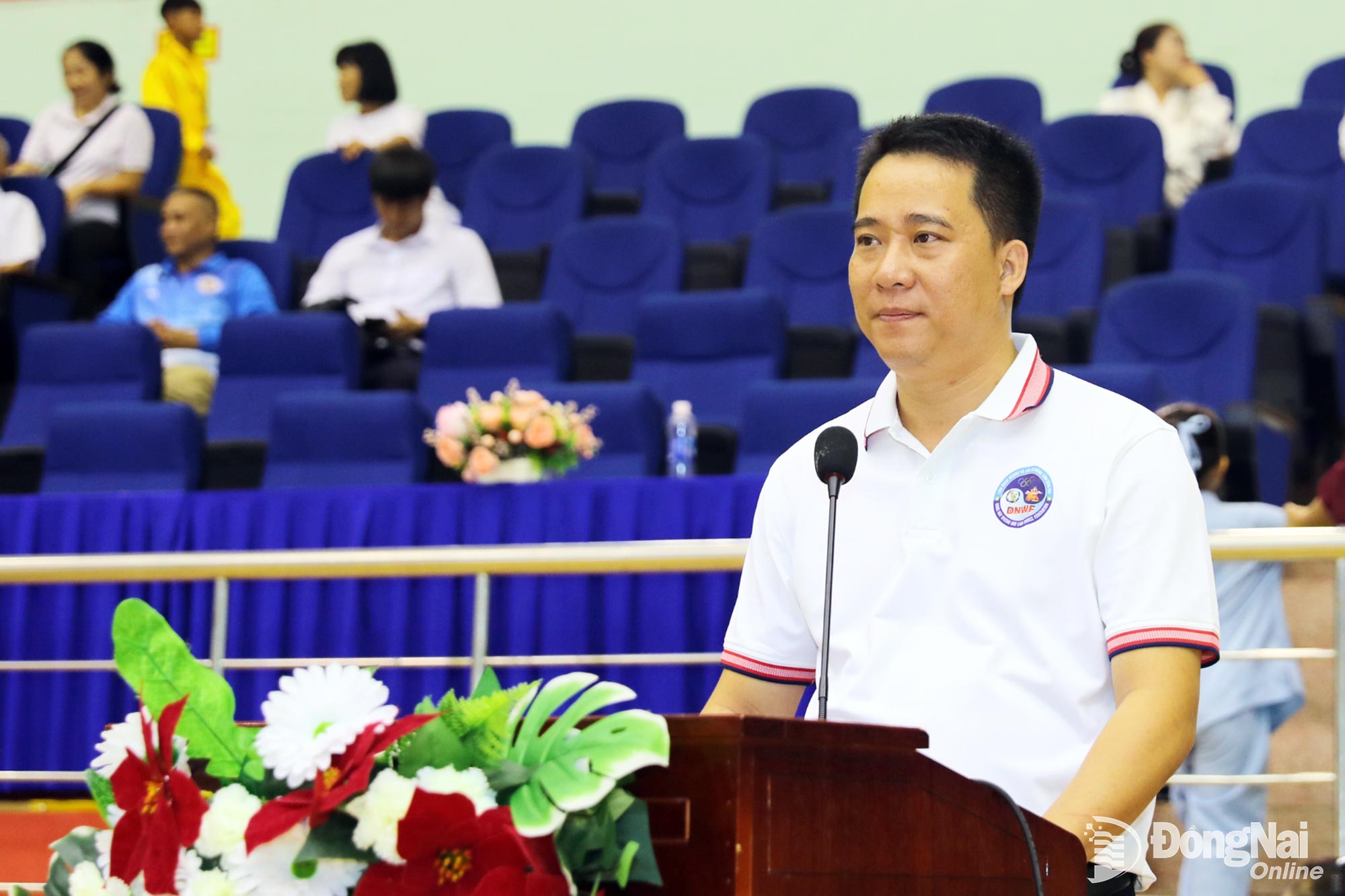 Chủ tịch Liên đoàn Wushu và Lân Sư Rồng tỉnh Đồng Nai Trần Quốc Văn phát biểu khai mạc. Ảnh: Huy Anh