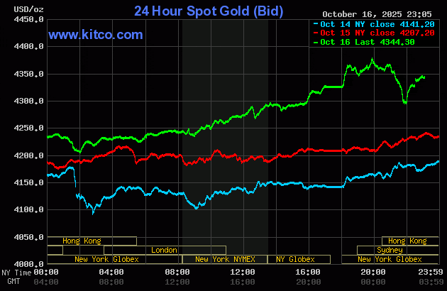 Tính đến 10 giờ ngày 17-10 (giờ Việt Nam), giá vàng thế giới tăng 137,1 USD so chốt phiên trước đó lên mức 4.344,3 USD/ounce.
