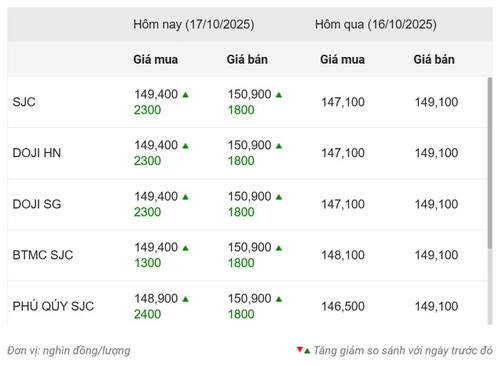 Cụ thể, tại thời điểm 10 giờ ngày 17-10, Công ty Vàng bạc đá quý Sài Gòn (SJC) niêm yết giá vàng miếng SJC mua vào-bán ra ở mức 150,7-152,2 triệu đồng/lượng, tăng lần lượt 3,6 triệu đồng và 3,1 triệu đồng so kết phiên trước đó. Chênh lệch mua-bán 1,5 triệu đồng/lượng.